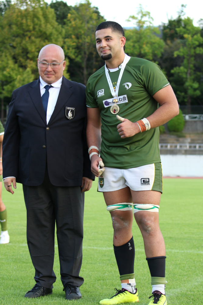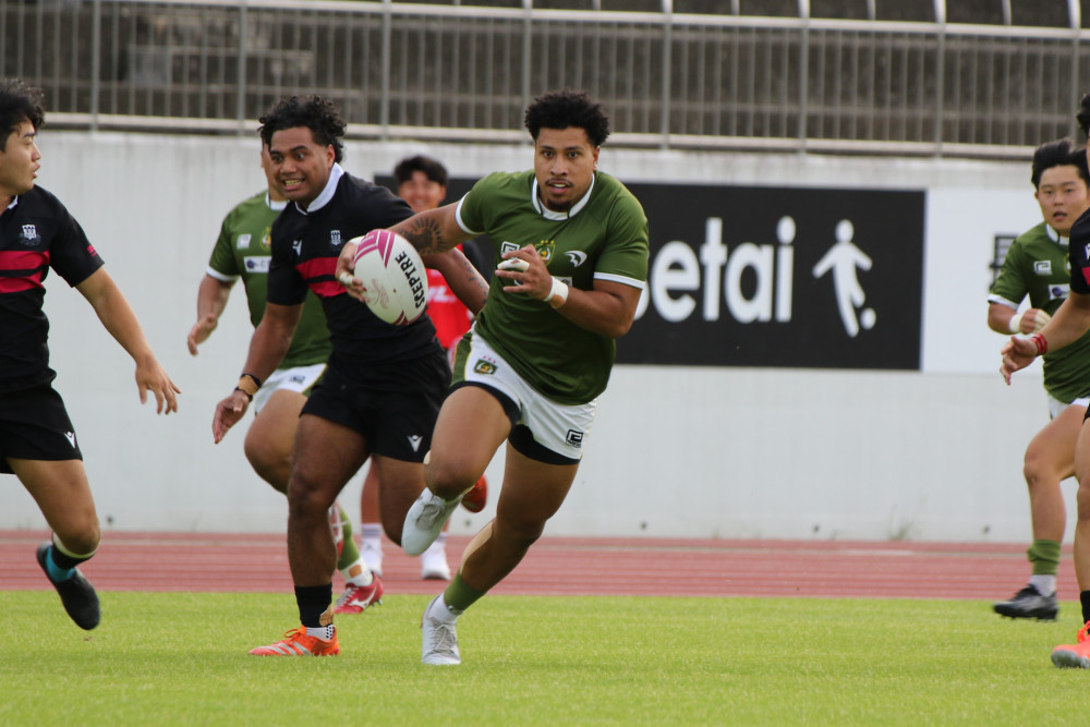 前半37分には、NO.8トファエオノが敵陣ゴール前で得た日大の反則からタップキックでスタートし、日大ディフェンスをなぎ倒し2トライ目を決め、ゴールも成功し14-17とする。同点に追いつくために追撃を仕掛けるも、前半終了間際にまたもサイドライン際で突破を許し、失点。前半を14-24で折り返した。