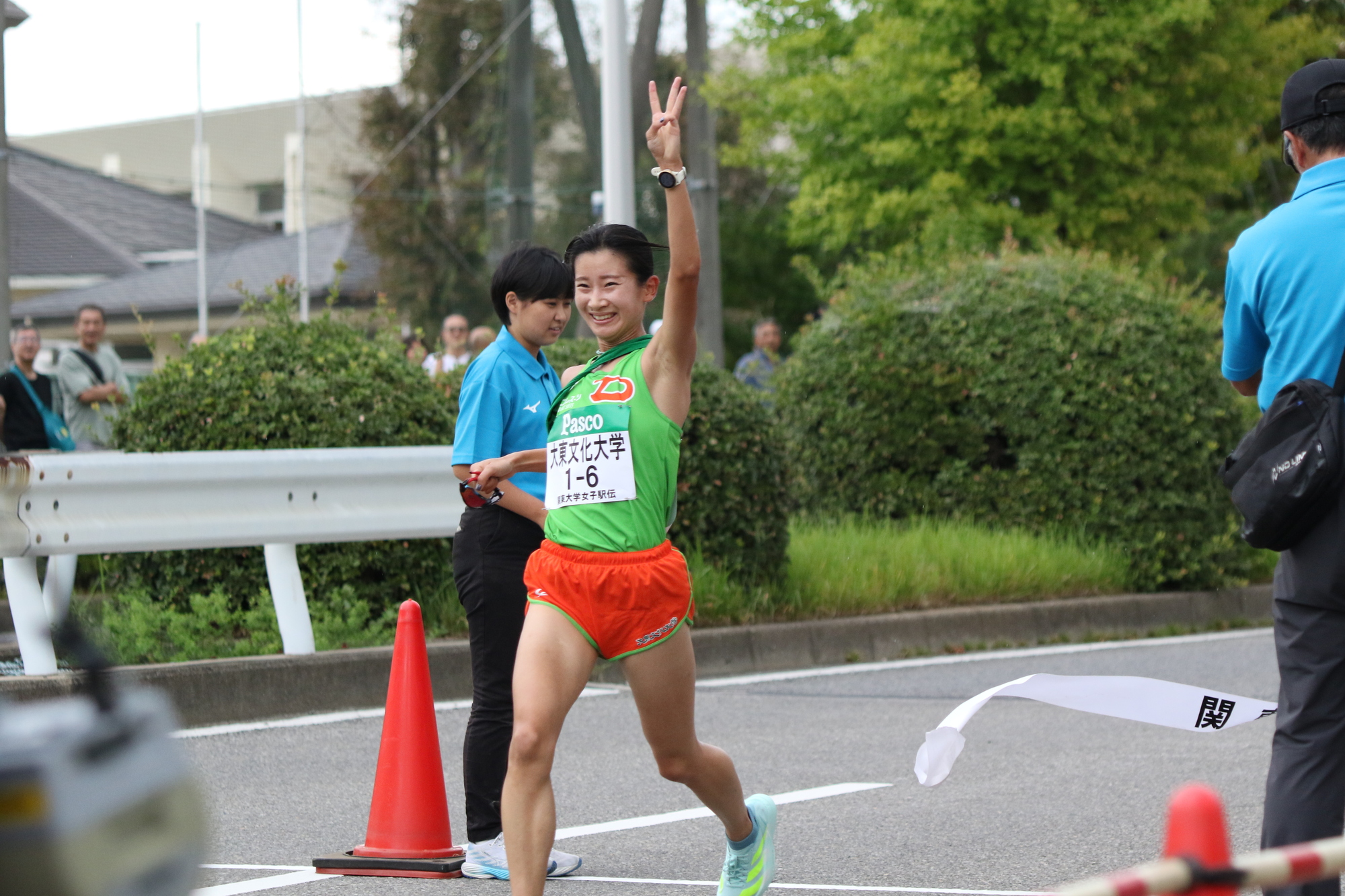 こう振り返った秋竹は、本人の想定を上回る23分37秒の区間新記録の走りを見せる。ここまで本学の独走状態でつながれたタスキはアンカー6区・平尾に渡った。昨年度の富士山女子駅伝でもアンカーを務めた平尾は、安定した走りを続け、笑顔でゴールテープを走り抜けた。