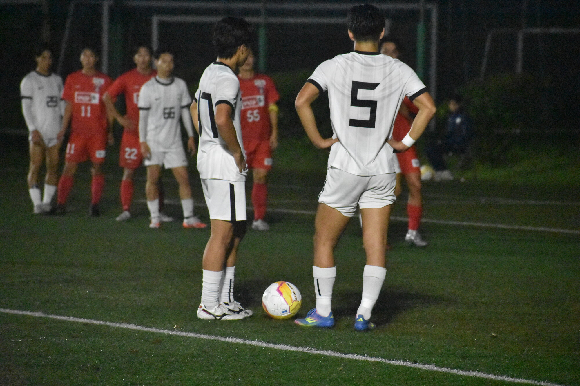 続く29分、相手のゴールキックの場面で相手GKがPA内より前でボールを蹴り間接FKのチャンスを得る。ボールを準備するのは佐古脩仁(経営4)と萩原駆(スポ科3)。佐古がボールを逸らし萩原が打つもDF陣に当たる。