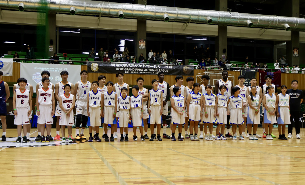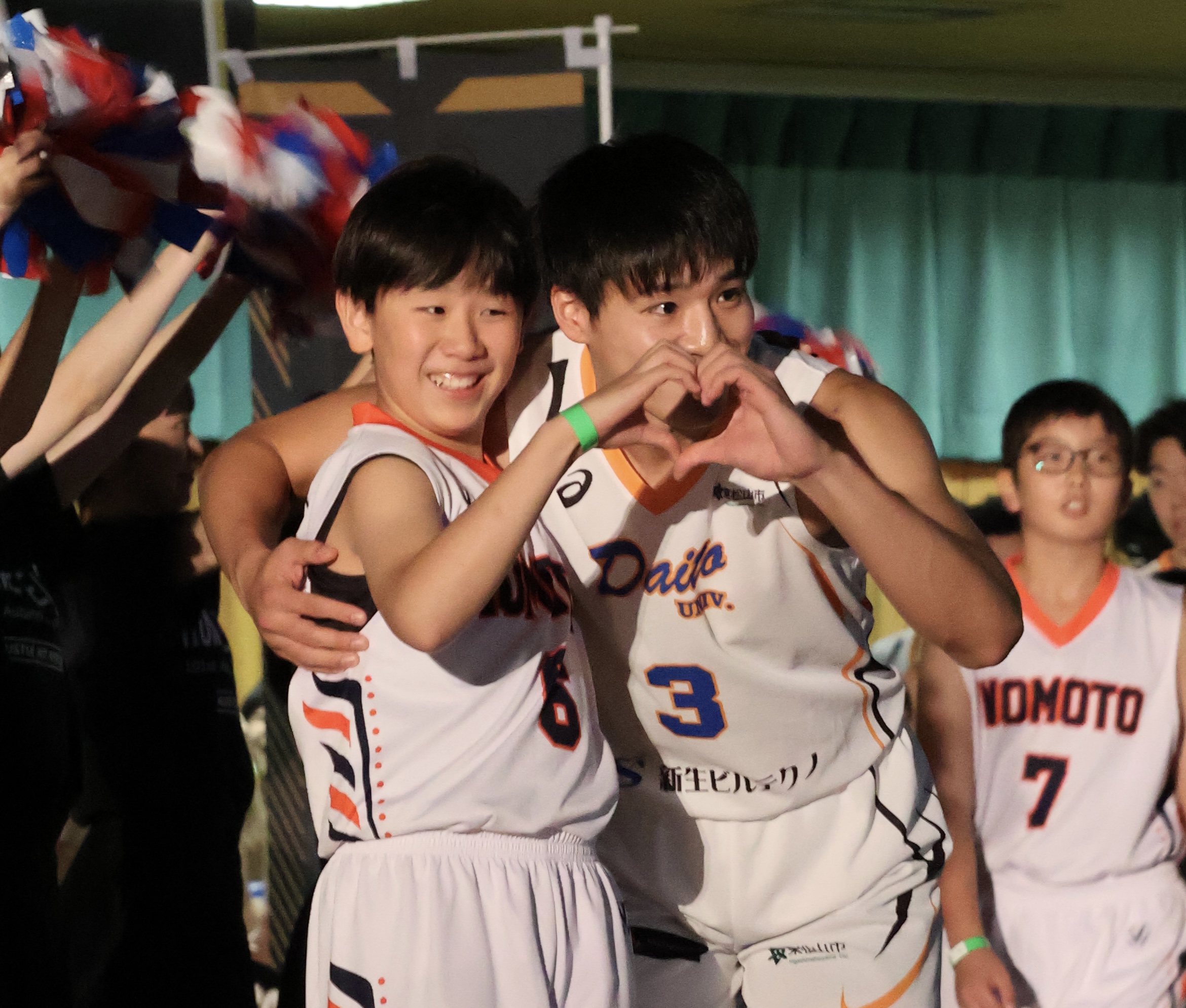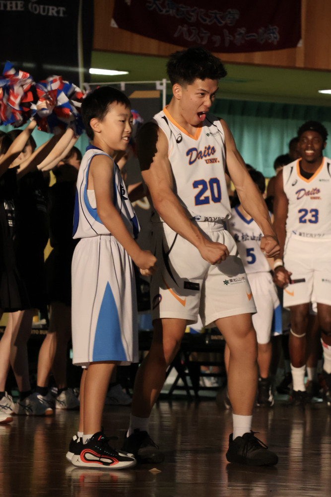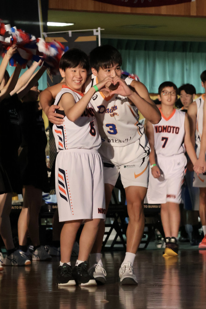 選手たちは、東松山市のミニバスケットボールクラブに所属している小学生たちと一緒に入場した。