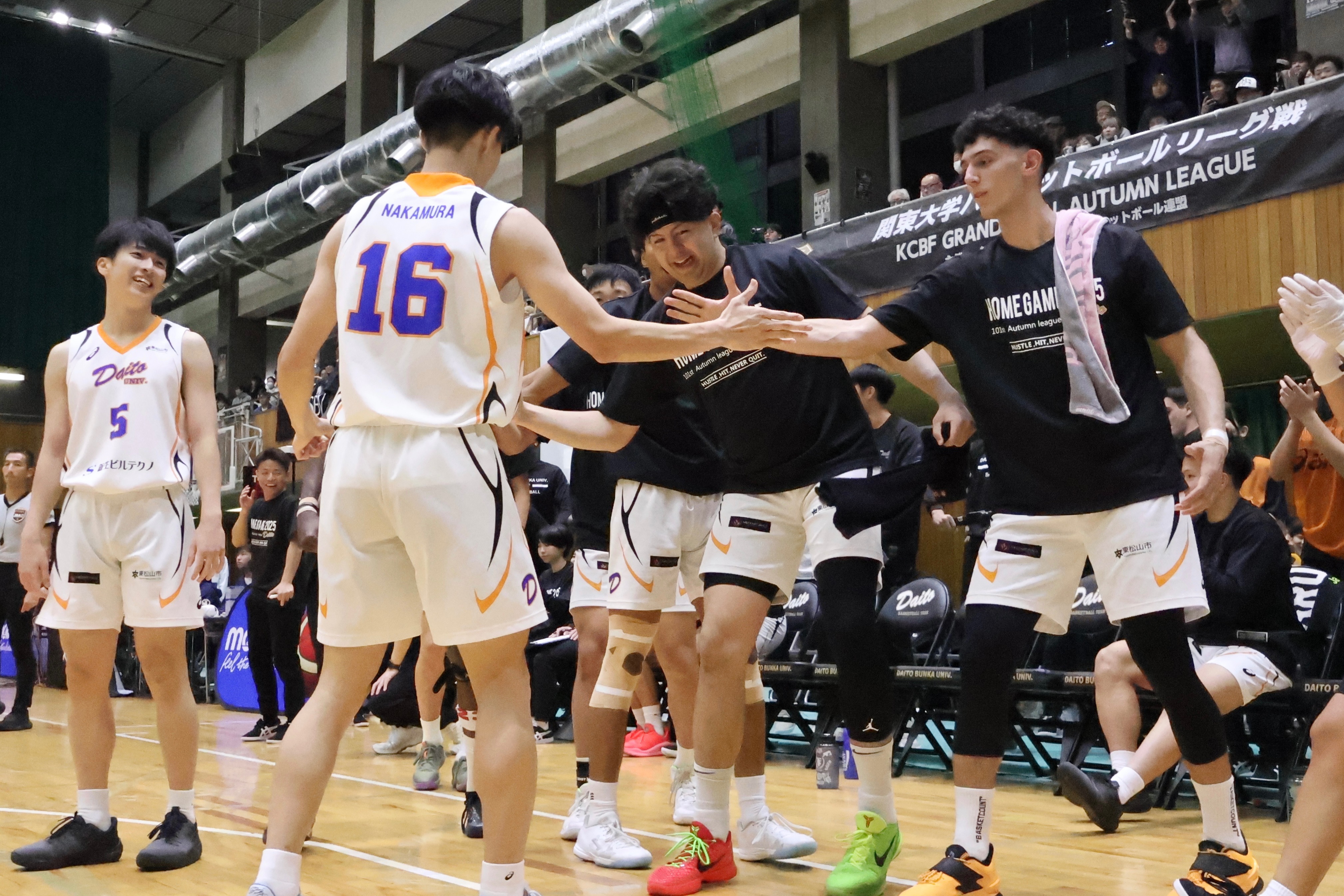 同点に追いつかれるも、主将の塚本智裕(4)がスリーポイントを決め、会場のボルテージは最高潮へ。さらに廣岡の2本目のスリーポイントが決まる。中村英司(2)がゴール下でバスケットカウントを獲得し、フリースローを決め、前半を43-32でリードし終えた。