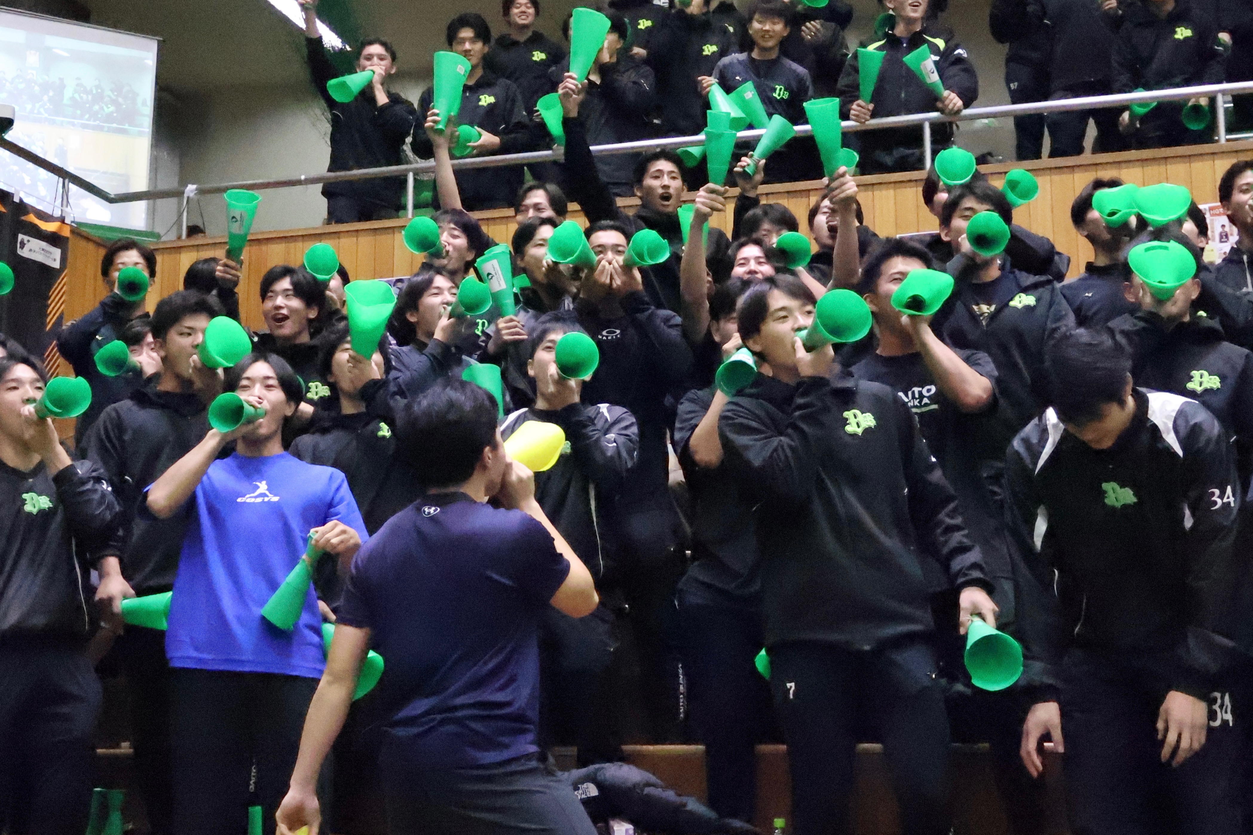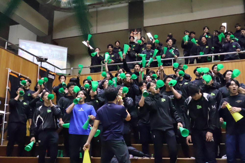 前半と後半の間にある20分間のハーフタイムは、本学硬式野球部の力のある大きな声が響いた。We are 大東 や 戦闘開始!といった多様な応援歌で会場を大いに盛り上げた。