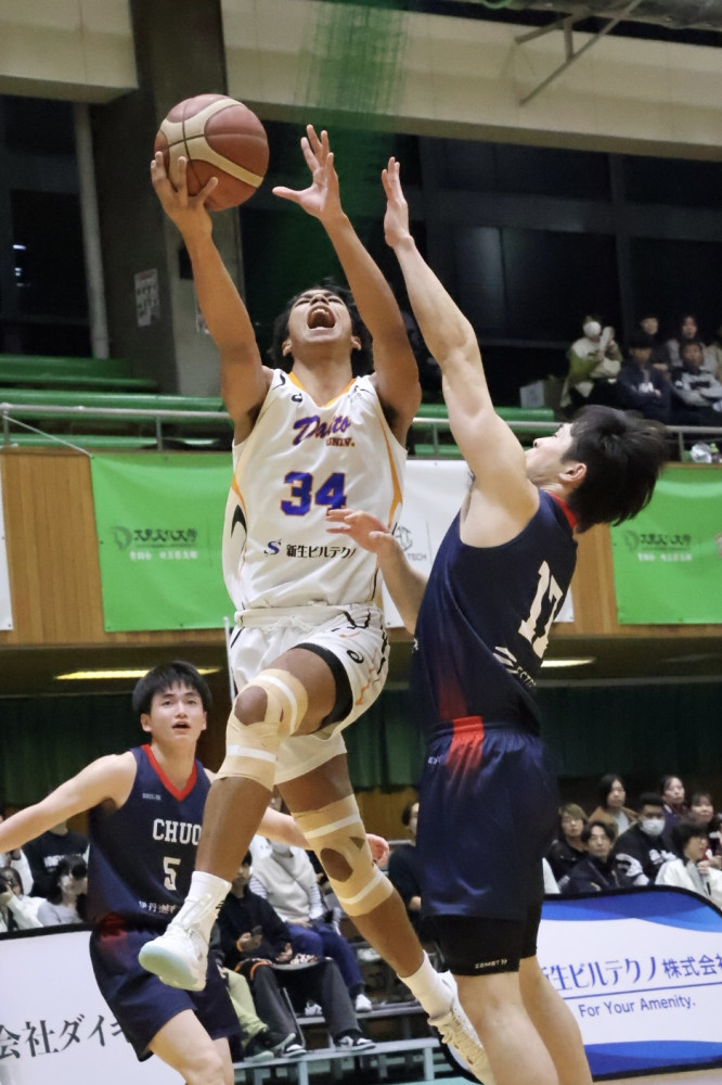 直後にタイムアウトをとった中央大学がスリーポイントを決め、徐々に点差が追いついてくる。