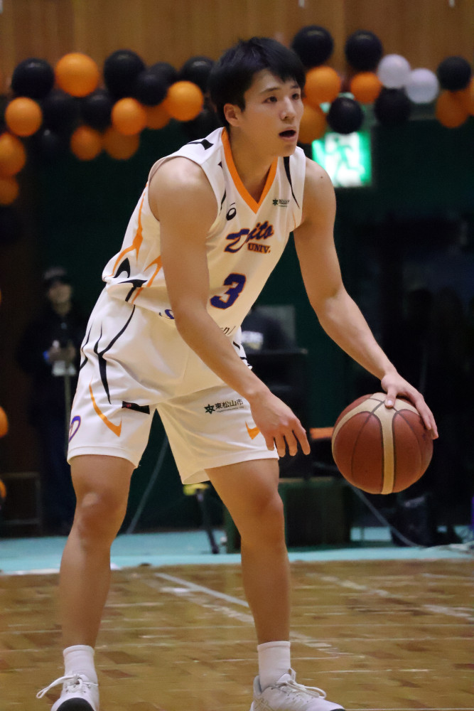 第4Q序盤に髙橋 諒(2)がスリーポイントを決めると、応援に駆けつけた本学野球部や観客が大きな歓声をあげる。中盤、塚本智裕(4)が角度がない難しい位置からのシュートを決めた。