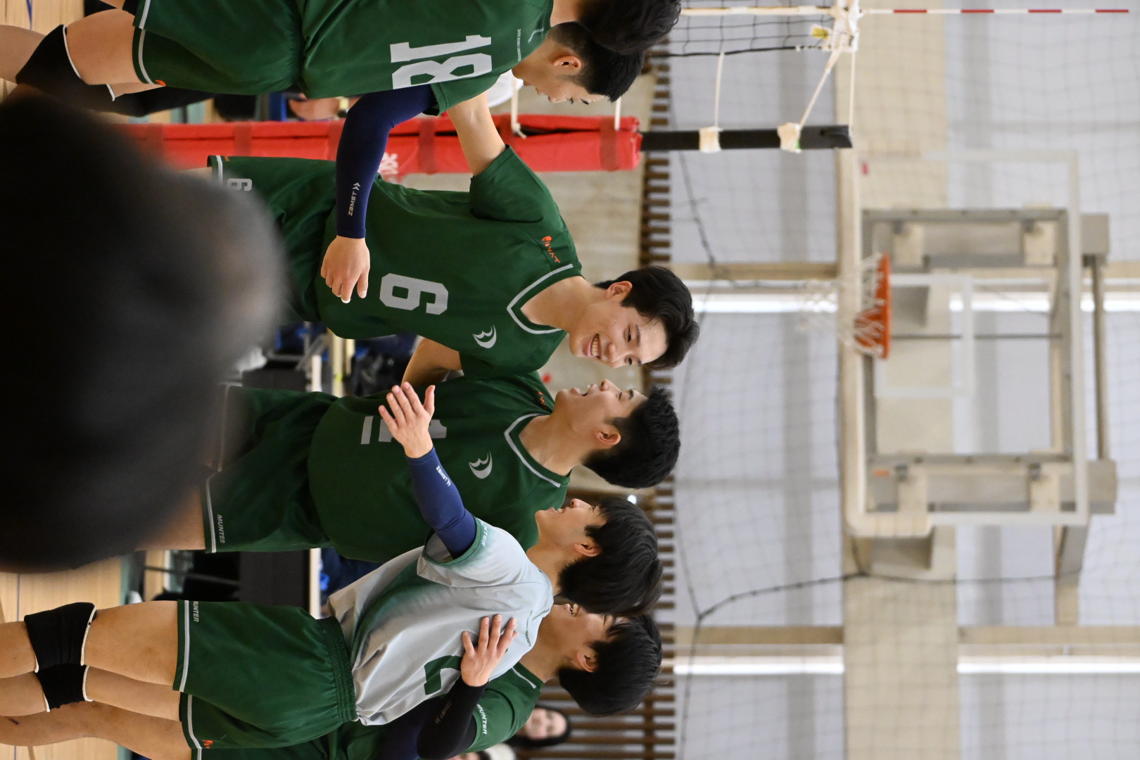 第3セット、このセットは取られるわけにはいかない本学。3番川中太翔(経営4)が高身長を生かした攻撃で2連続得点するものの、序盤から取って取られての攻防が続き、なかなか点差が広がらない。14-11と一時3点もの差がつくが、19-19でまたも同点となる。先に20点台に乗ったのは本学。清家のセンターからの強気な攻撃により20-19とする。服部のバックアタックから相手のミスを誘うプレーで2連続得点。野添のサイドラインギリギリを攻めたサーブが惜しくもアウトになるが、落ち着きを見せた14番工藤晃輝(スポ科2)のスパイクで24点のセットポイントを握る。最後も工藤のスパイクがブロックアウトを狙い25点目を取り切り、25-23でこのセットを終える。セットカウント1-2で、1セットでも取られたら試合終了の窮地に立つ本学。