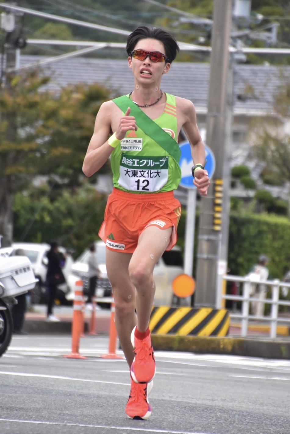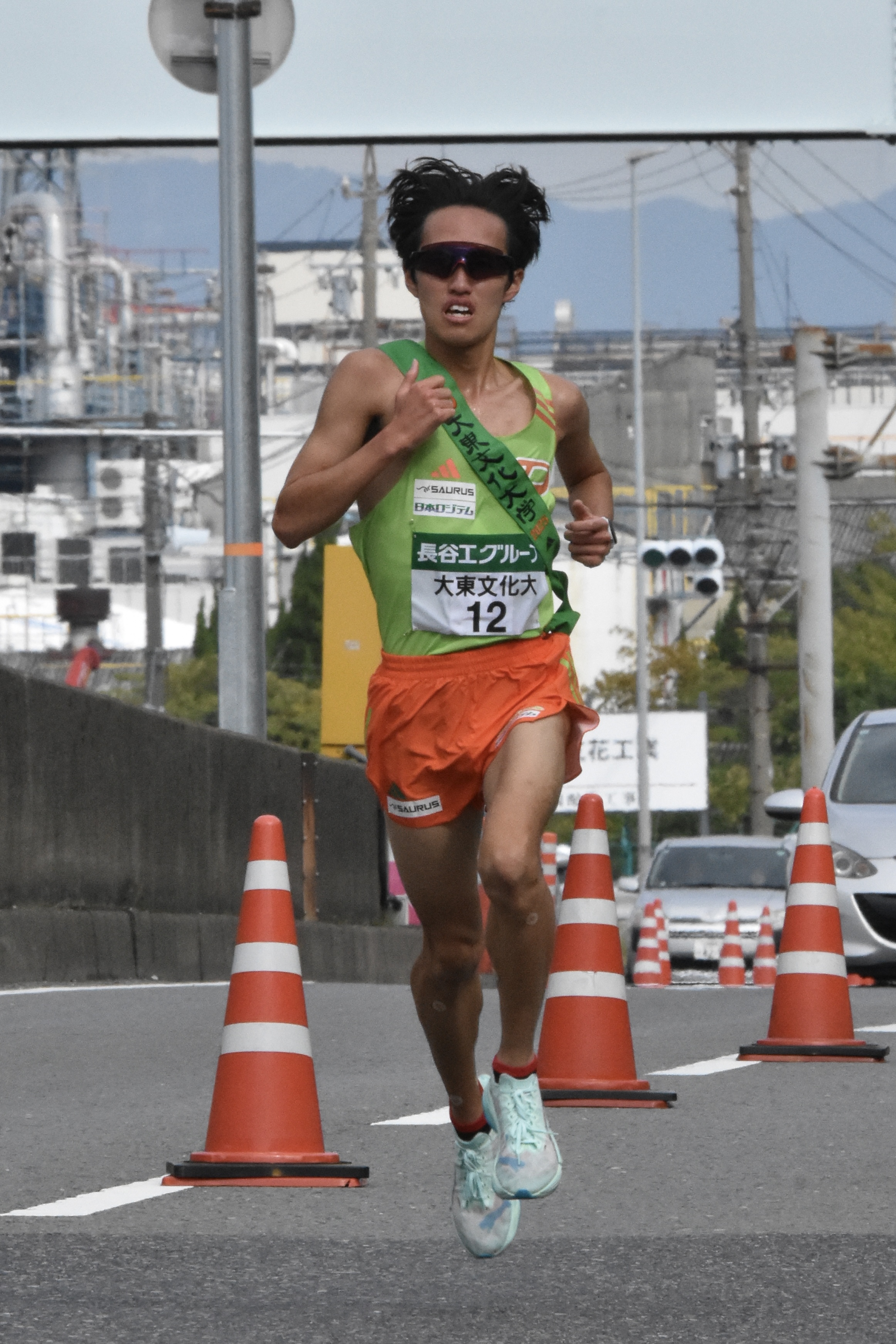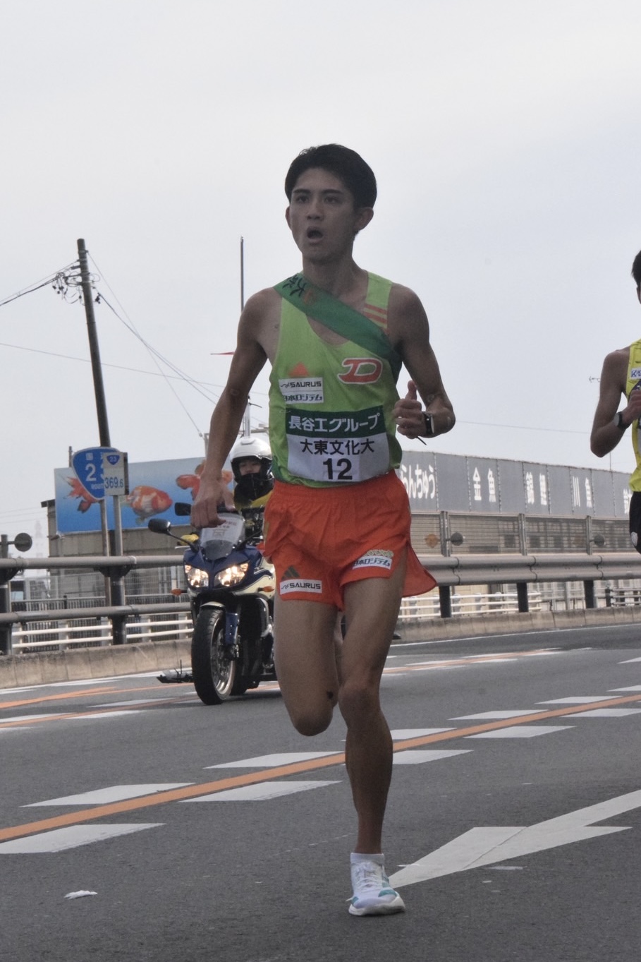 12位で全長1040mの揖斐・長良大橋を越えてスタート。13位と順位を2つ下げたものの、8位・青山学院大との差は1分22秒と、タスキを受けた時より10秒詰めてみせた。大濱から中澤真大(2)へ、2年生同士のタスキリレーとなった。