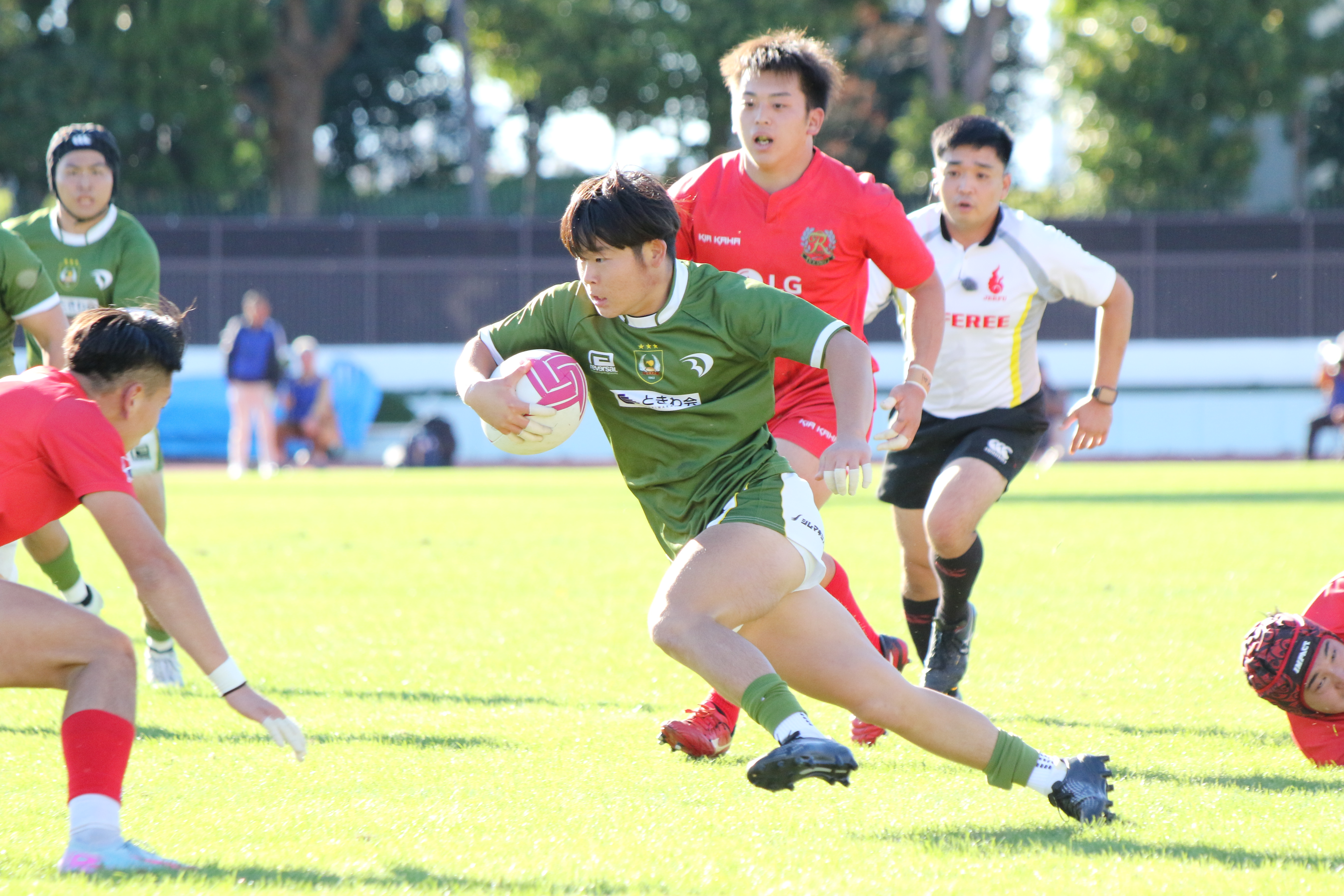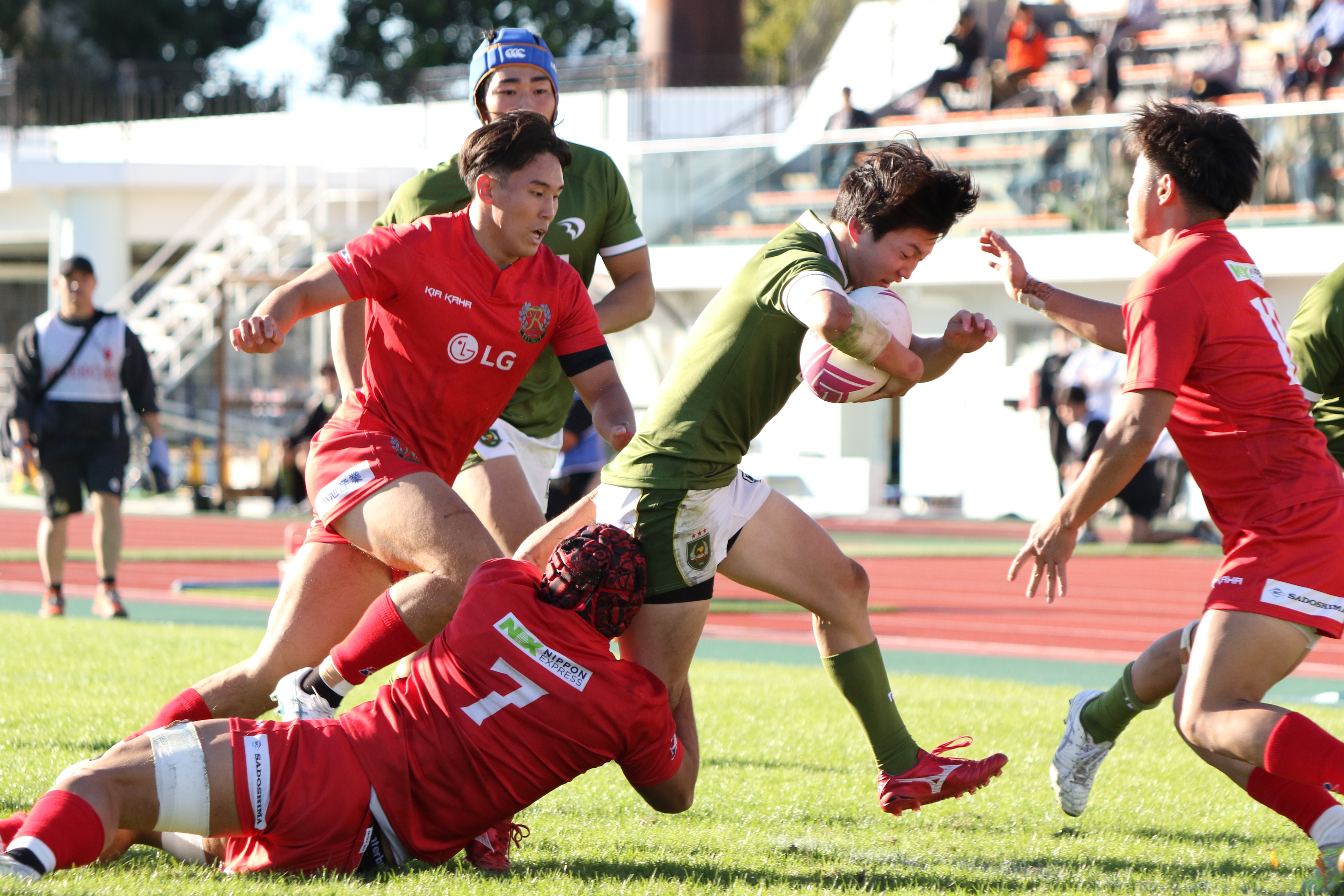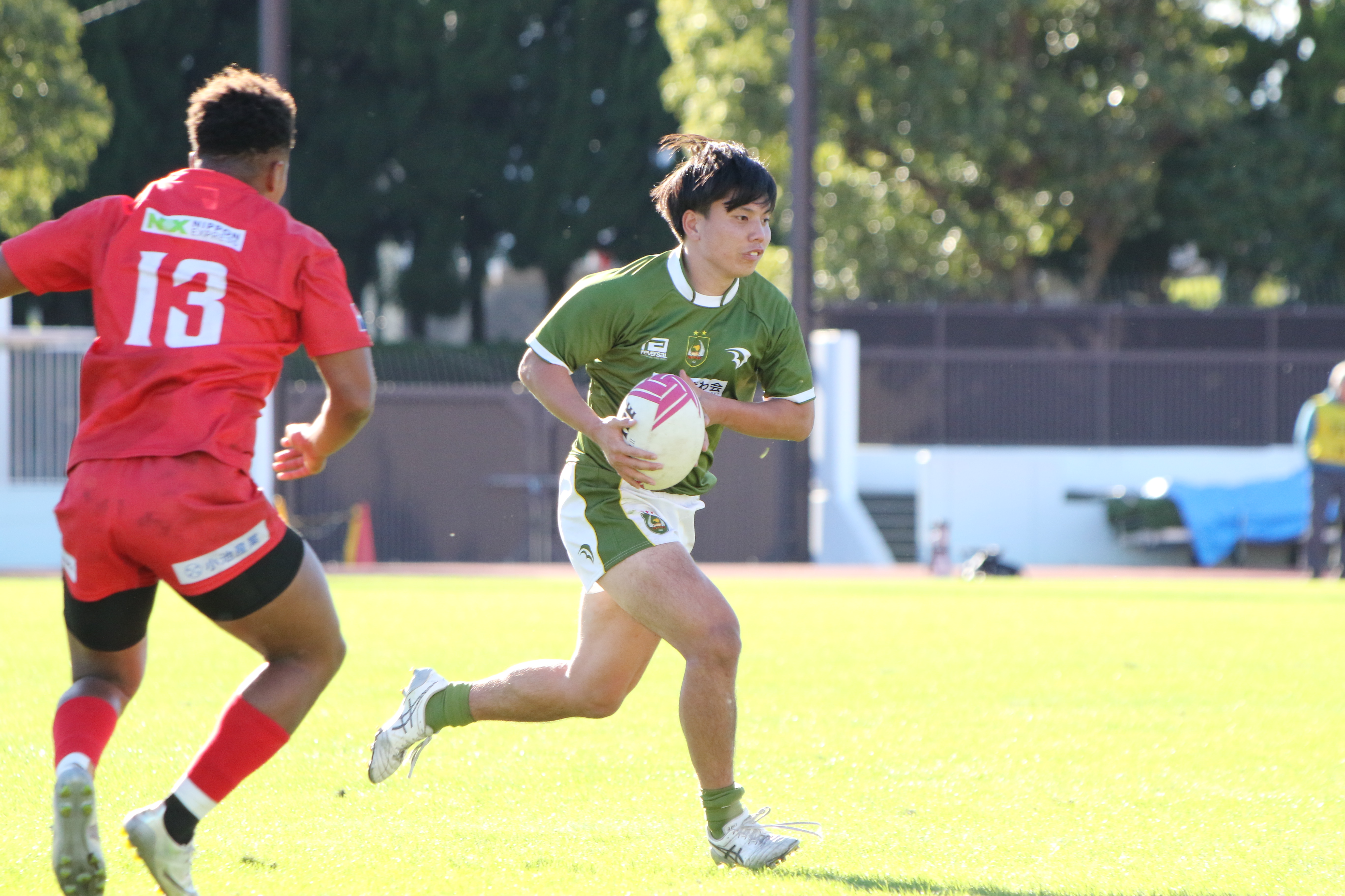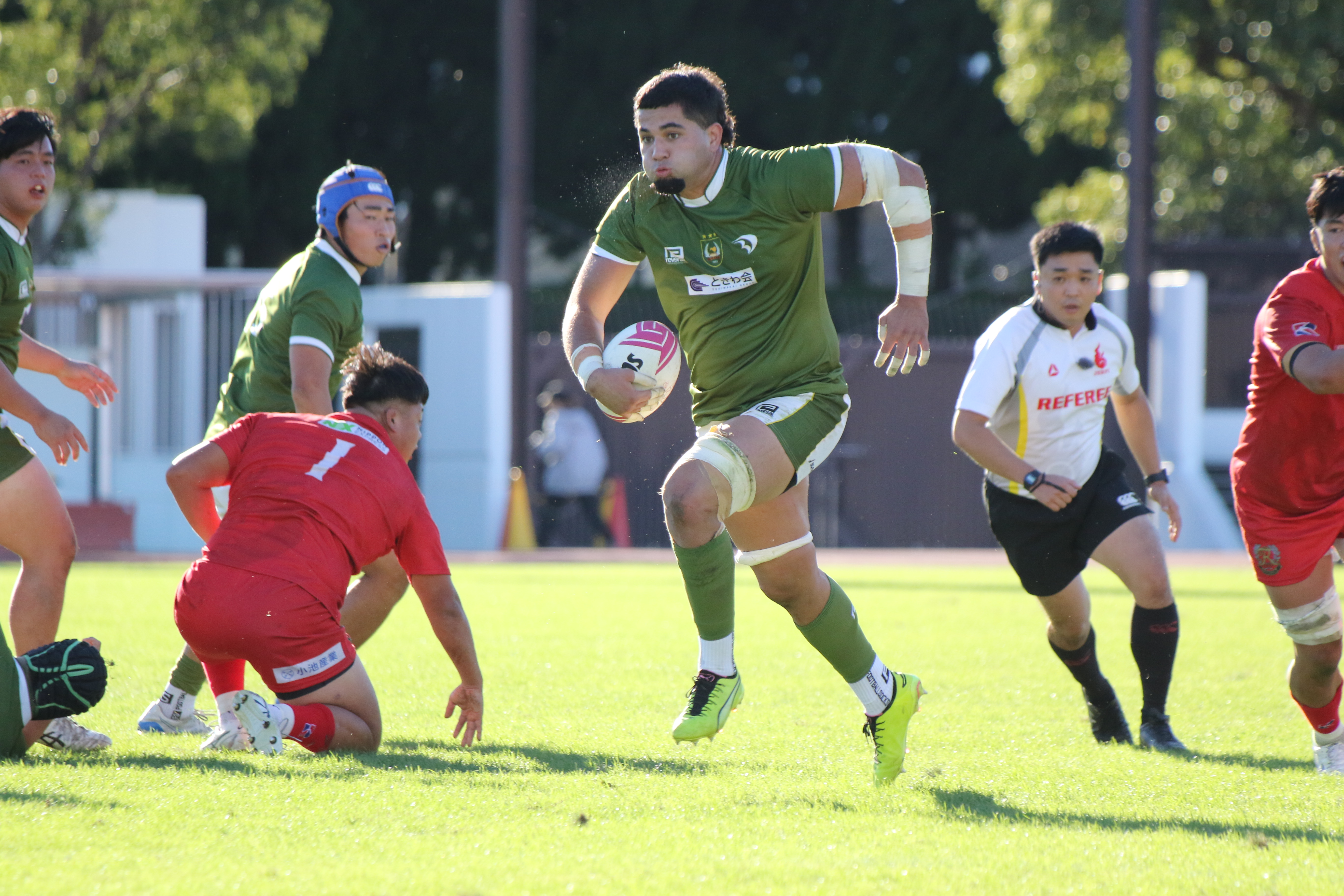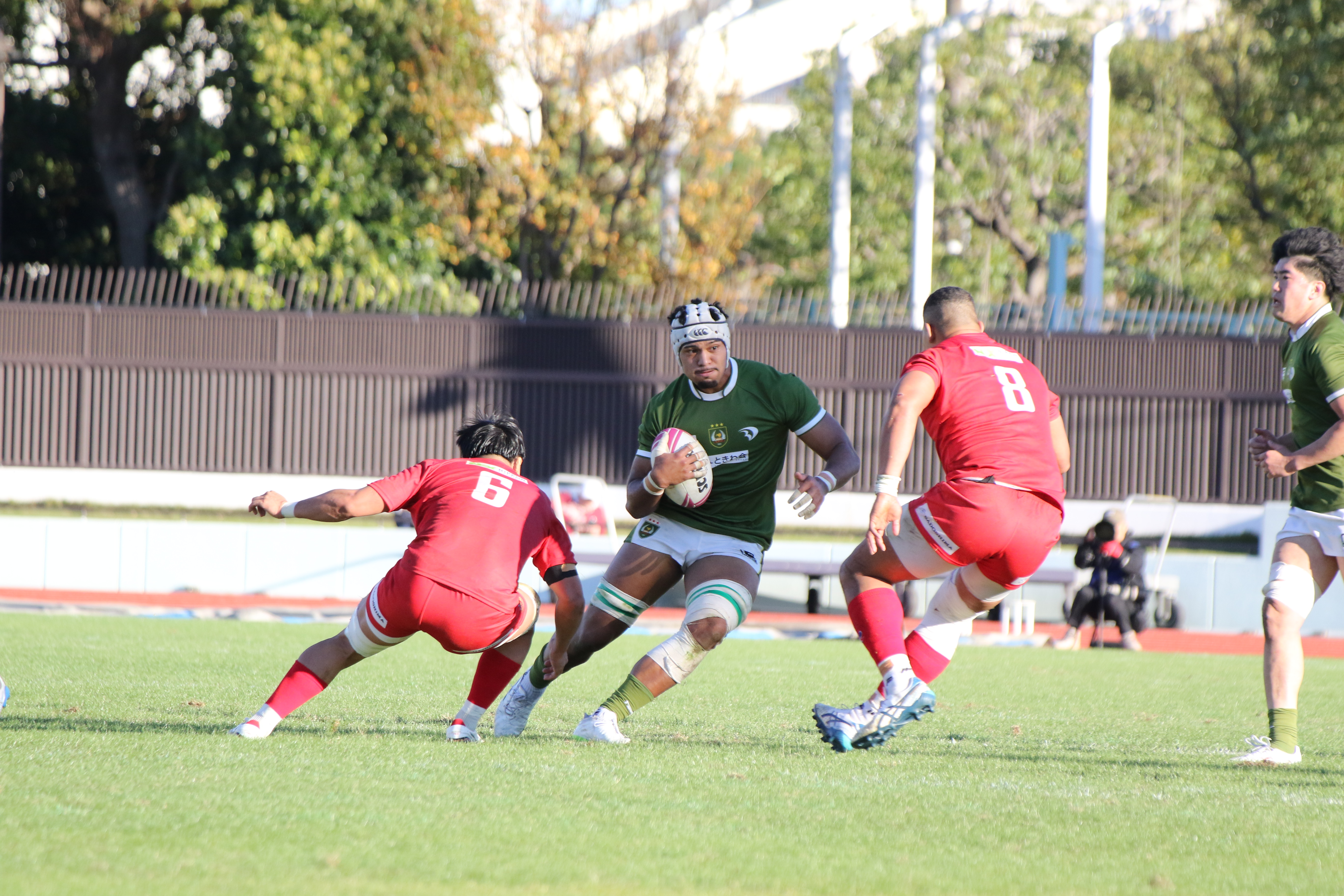 先制点を取られた大東大は反撃をするべく果敢に相手陣地に攻める。No.5ムナ・ヴィリ(外国2)が相手のディフェンス人を薙ぎ倒しながら進む。しかし、相手にボールを奪われてしまい、逆に攻められてしまう。ボールは左側へとパスされていき、トライを許してしまう。