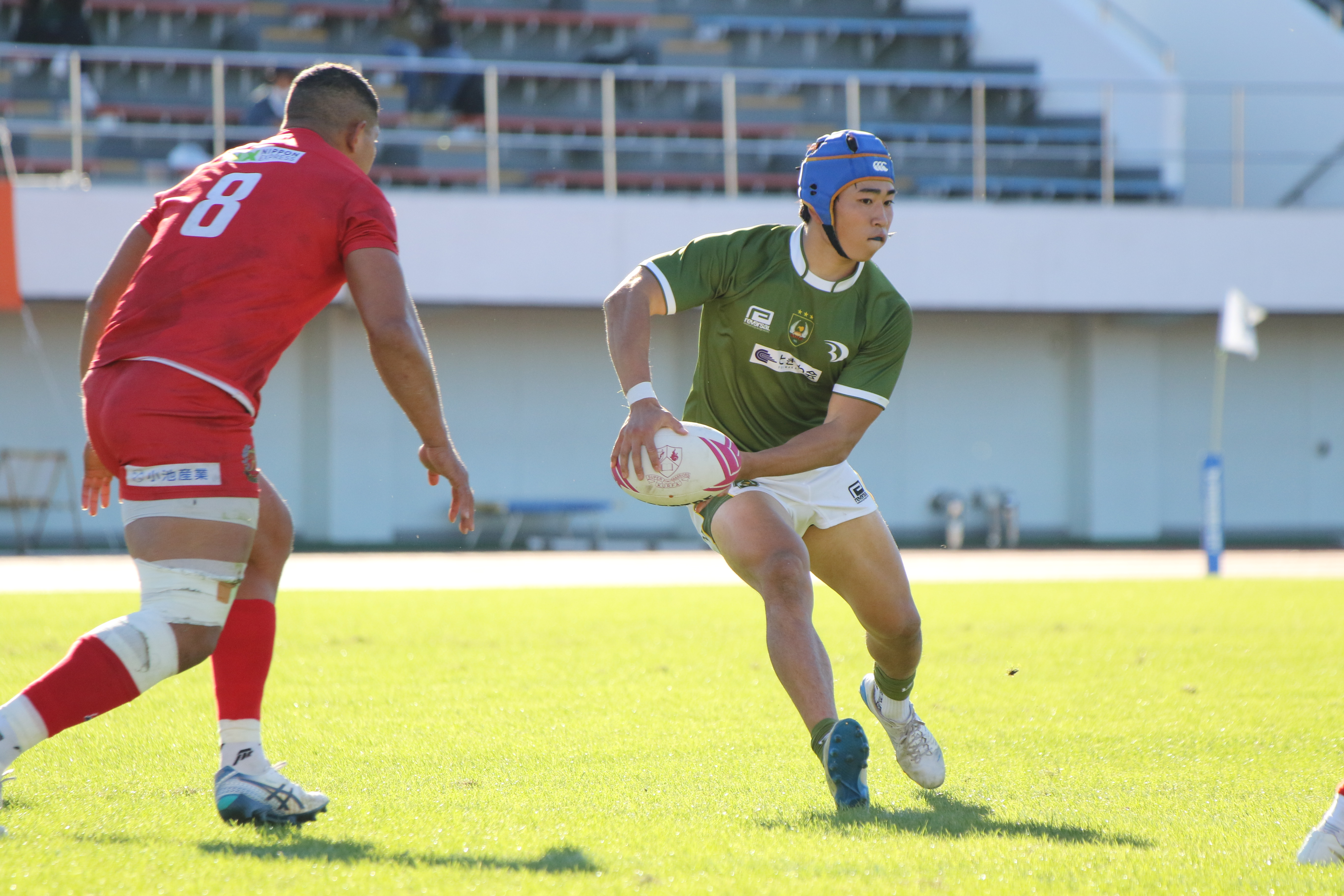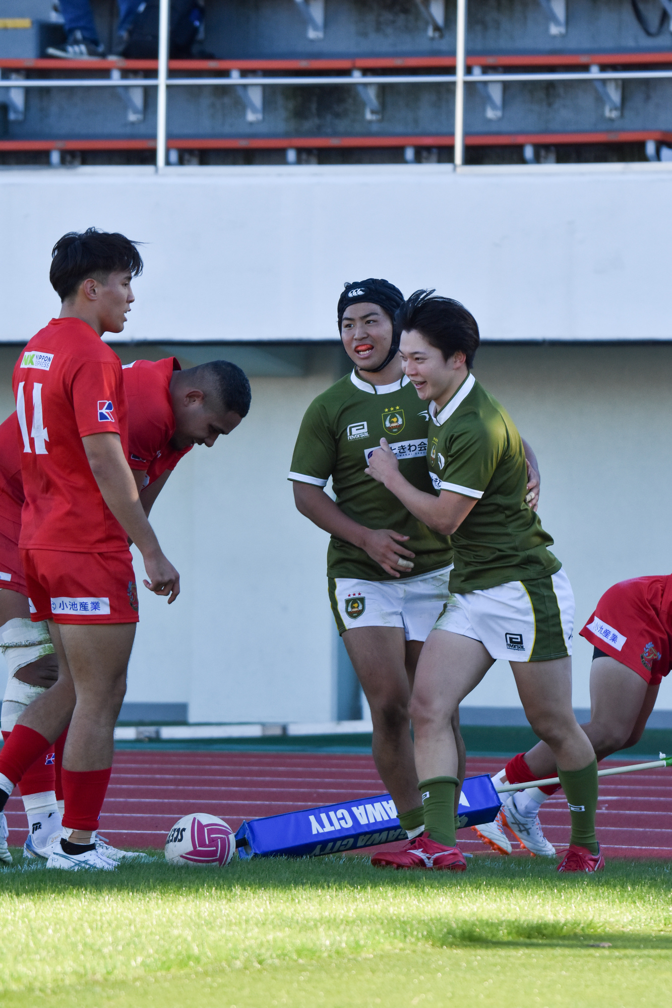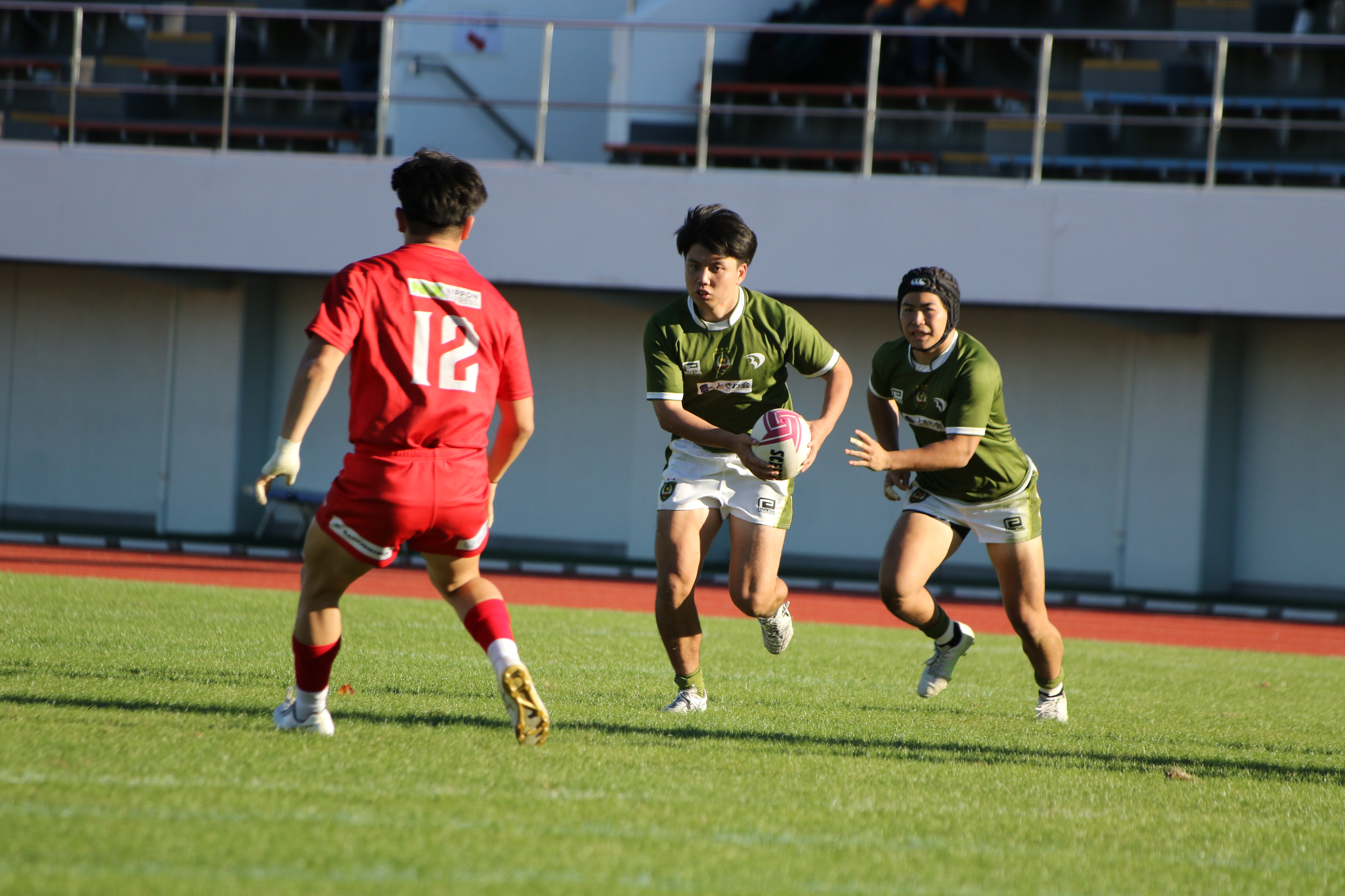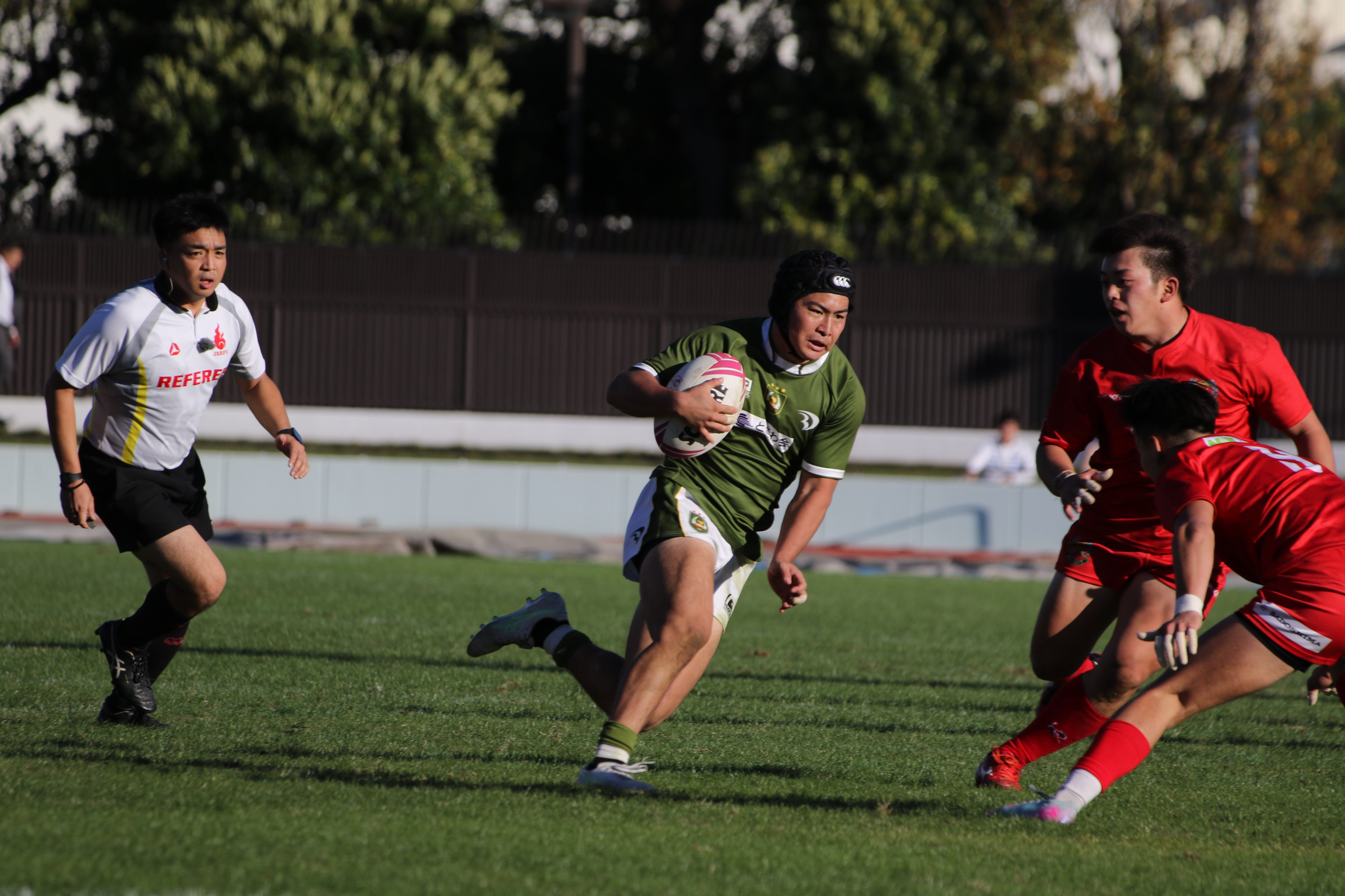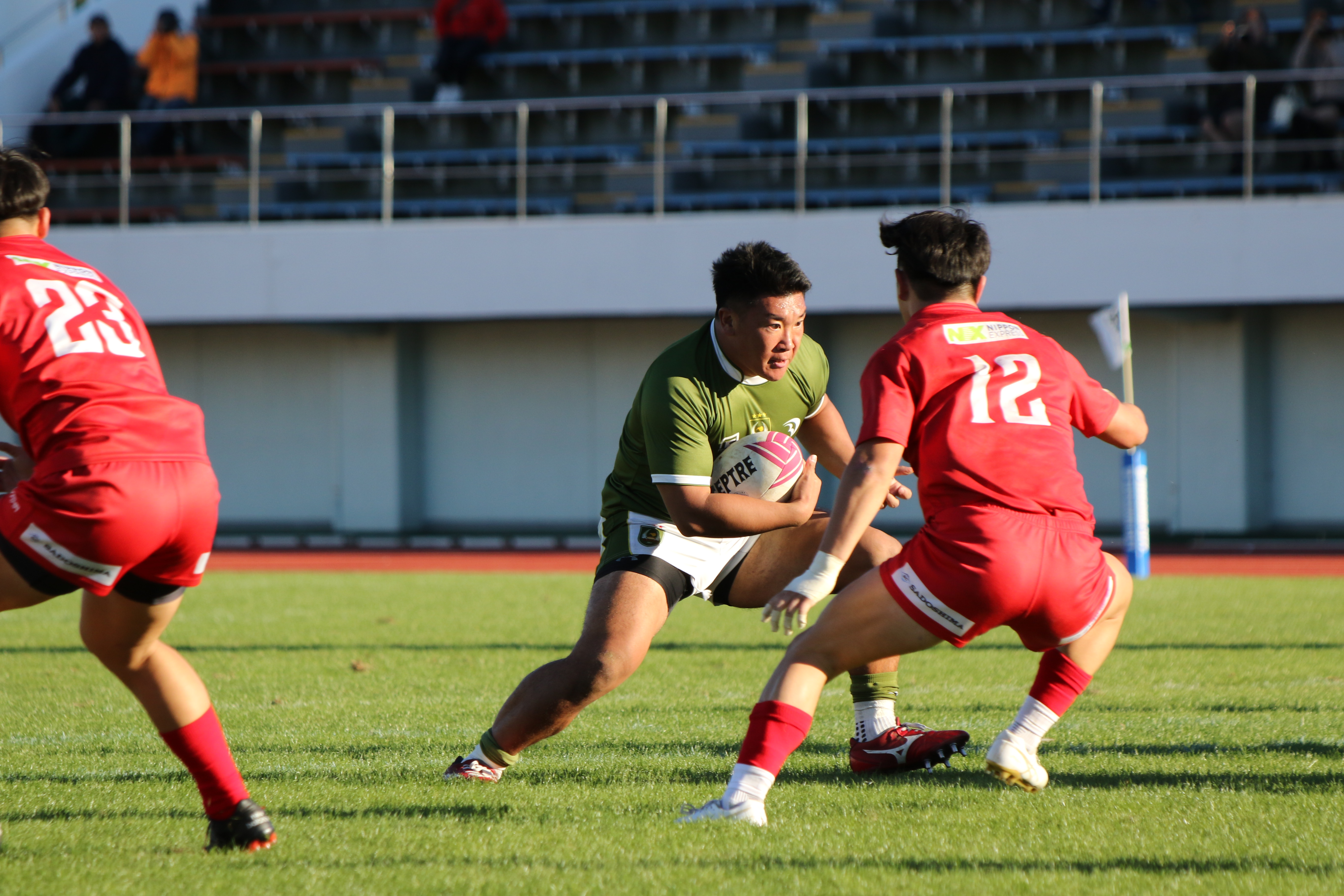 先制点を取られた大東大は反撃をするべく果敢に相手陣地に攻める。No.5ムナ・ヴィリ(外国2)が相手のディフェンス人を薙ぎ倒しながら進む。しかし、相手にボールを奪われてしまい、逆に攻められてしまう。ボールは左側へとパスされていき、トライを許してしまう。