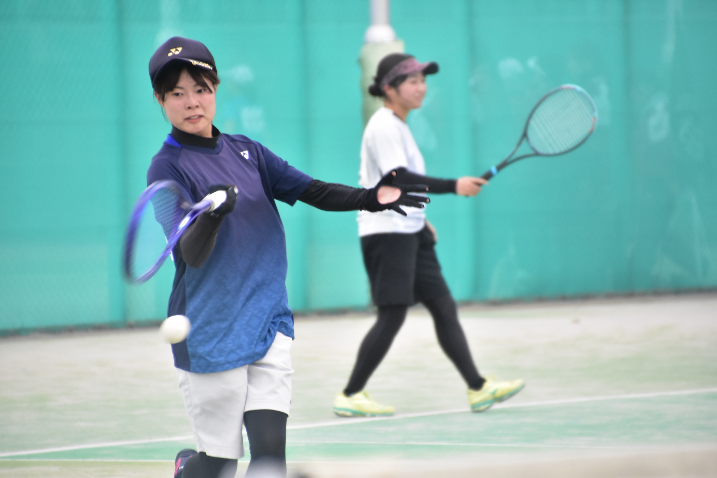 女子はダブルス、シングルス、ダブルスの順で行うが、対戦相手である昭和学院短期大学はダブルス1ペアが棄権。3試合目が不戦勝となる本学は、残り2試合のうち1勝することができれば、4部昇格となる状況であった。