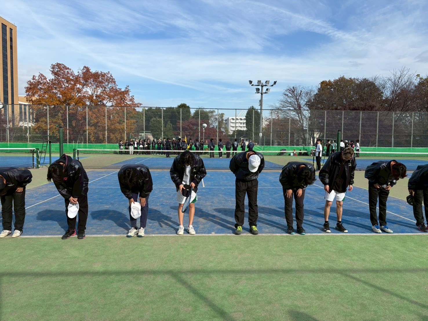 ▲試合後、ベンチメンバーと応援陣に頭を下げる男子チーム(提供:ソフトテニス部)