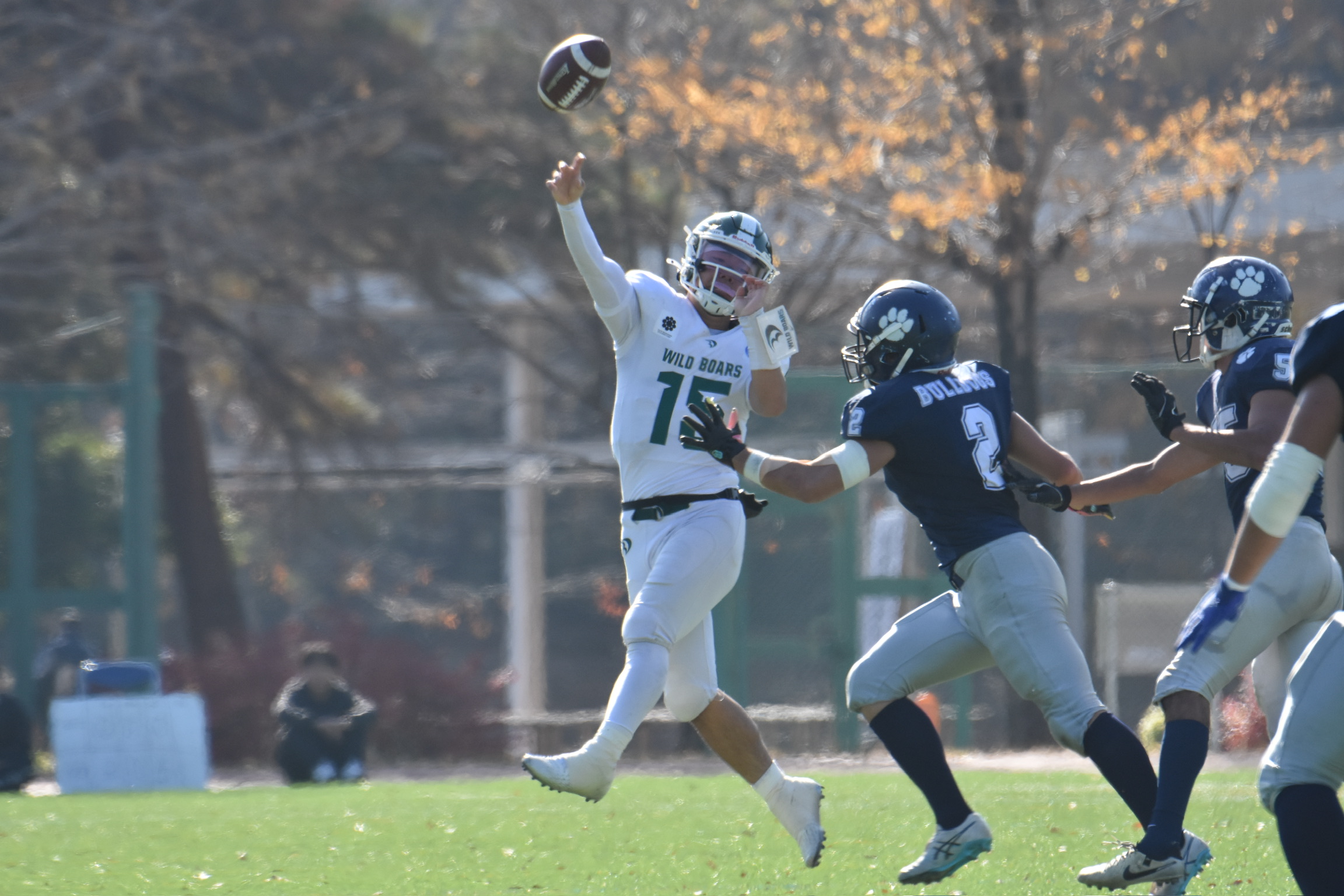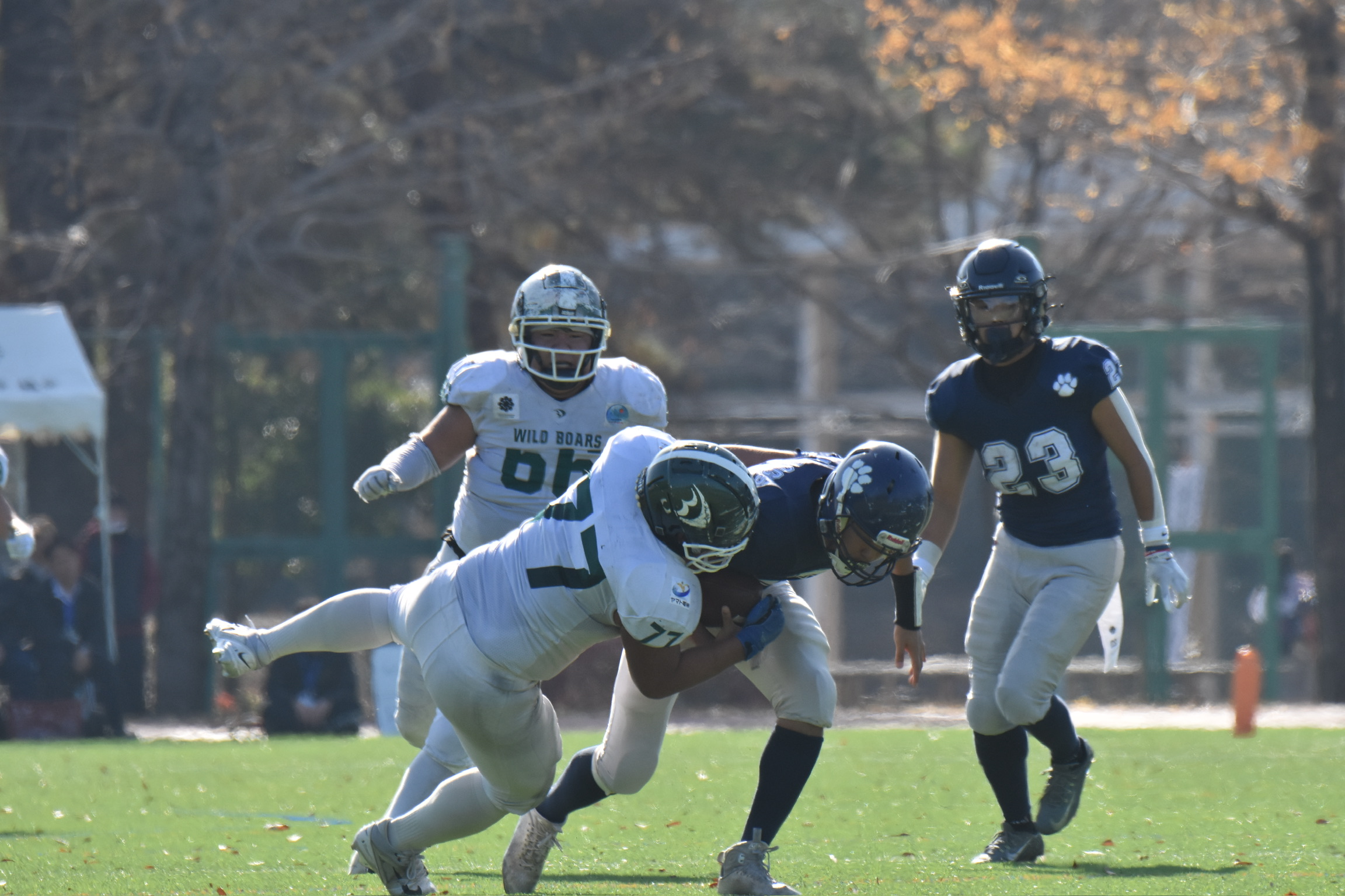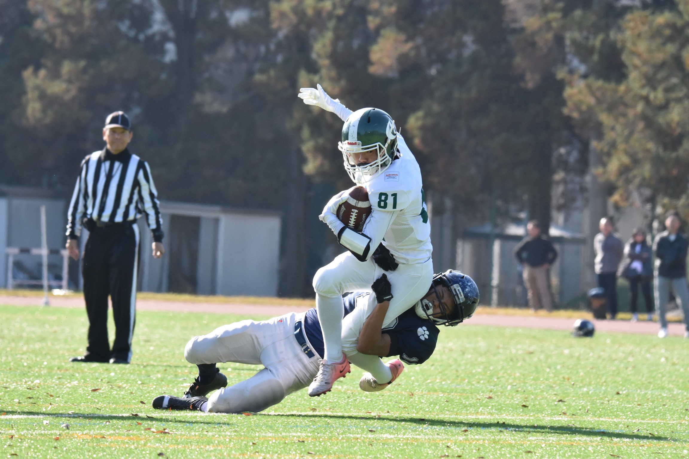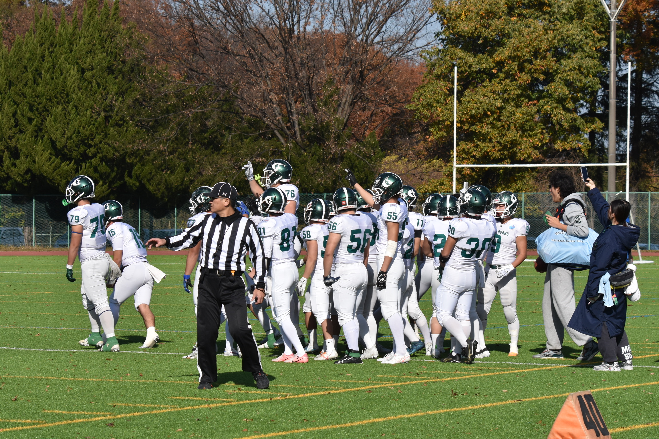 第2Q、本学DFは相手の動きをフィールド中央にとどめる。攻撃のチャンスが出てきた本学OFは動きに出る。第2Q終了間近、QB(クォーターバック)佐藤龍一(社会2)のパスを受け取ったRB(ランニングバック)細田隼人(法律3)がエンドゾーン手前までボールを運ぶ。広げた陣地を守りたかった本学DFだったが、パントによってコート中央まで戻されてしまう。第2Qも得点は動かず、前半が終了し、折り返す。