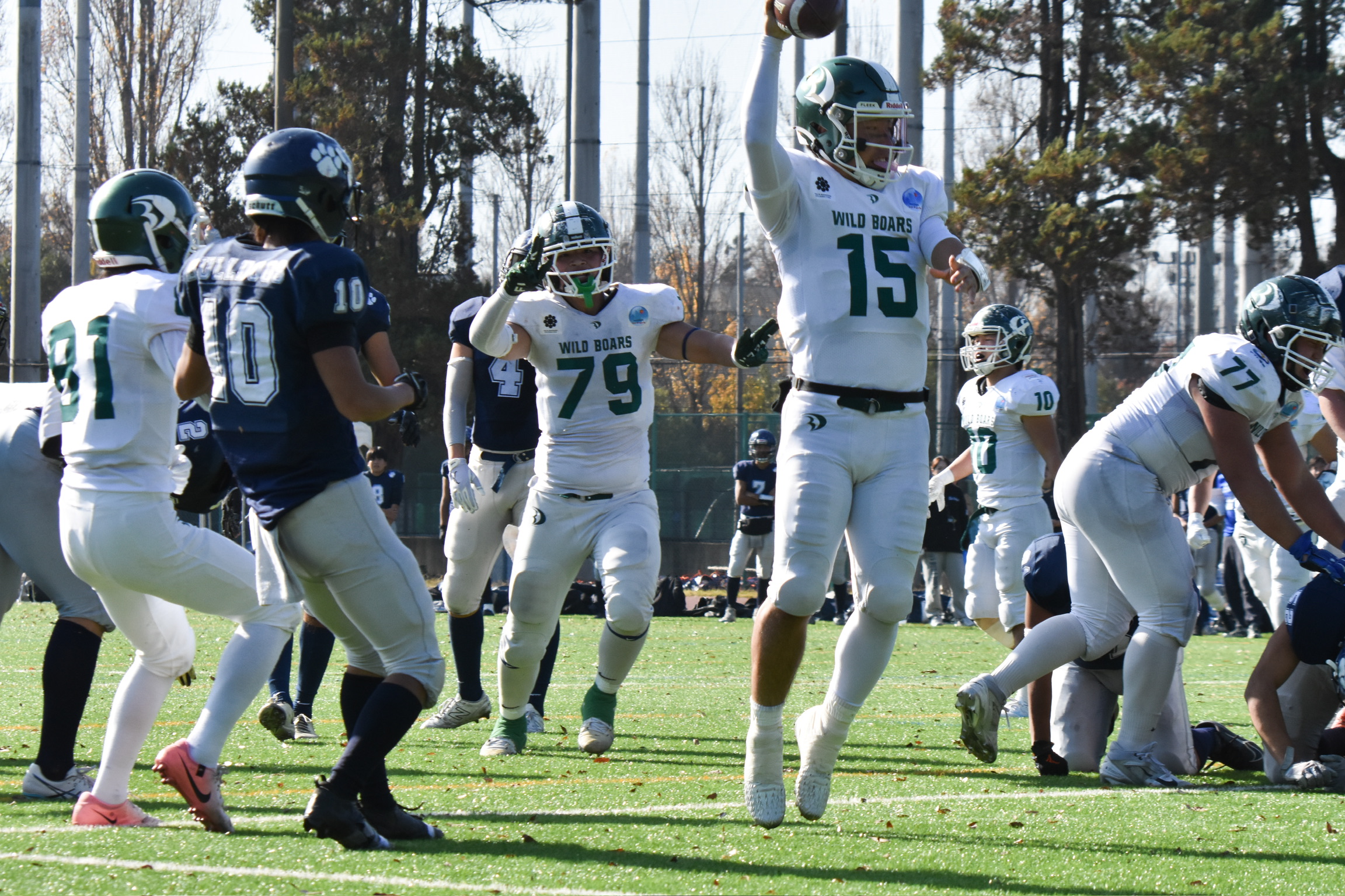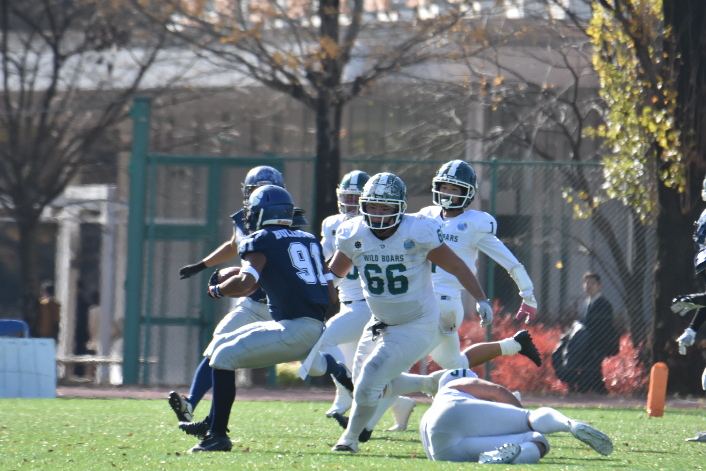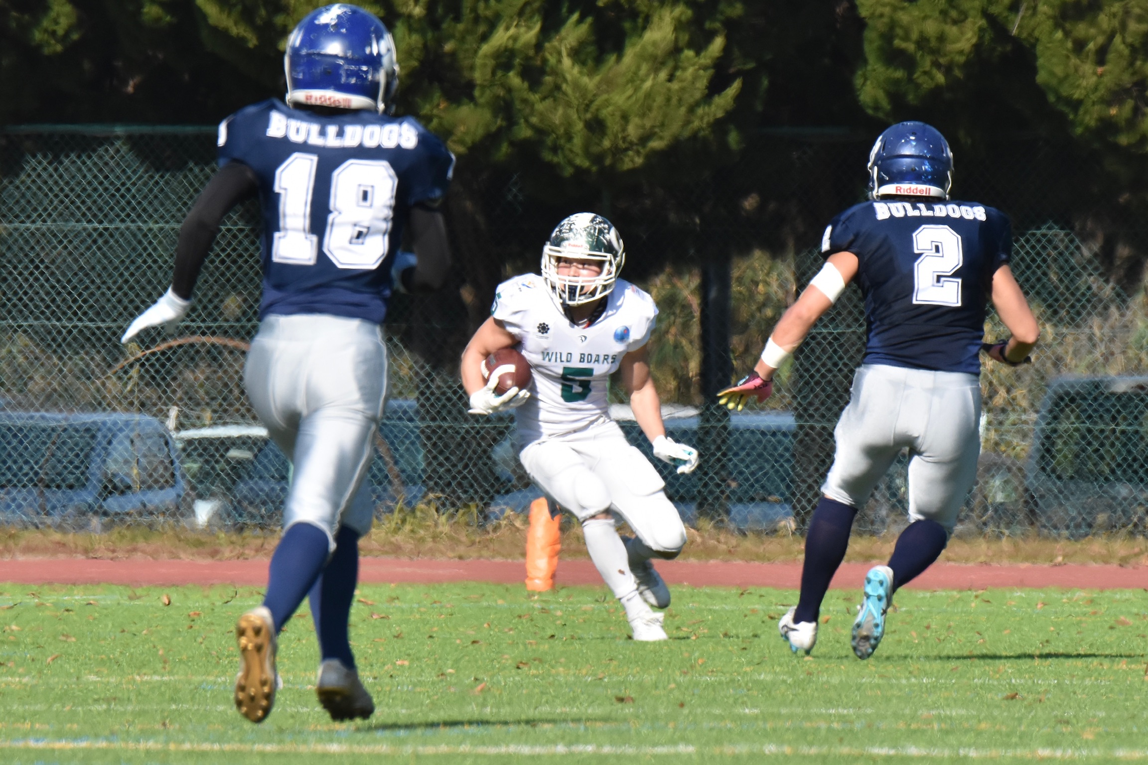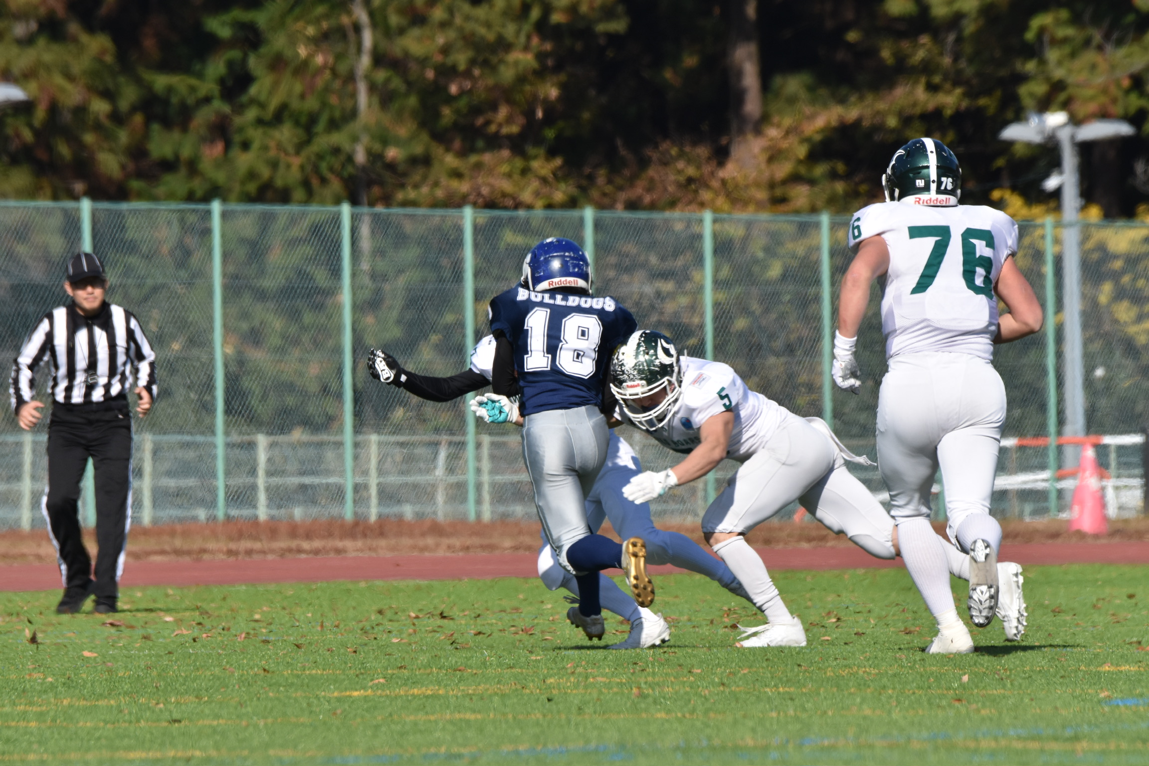 第4Q、攻撃に勢いがついた本学OFはオフェンシブ・ラインが立正大DFの壁を切り開き、そこに空いた穴に佐藤が自らボールを保持したままタッチダウン。続いて榎本のランプレーでボールを運ぶ。DFの動きをうまくかわし、40ヤードを走り切り、佐藤に続きタッチダウン。エクストラ・ポイントを獲得して試合終了間近で立正大に20-0で大きく差を開き、勝利となった。