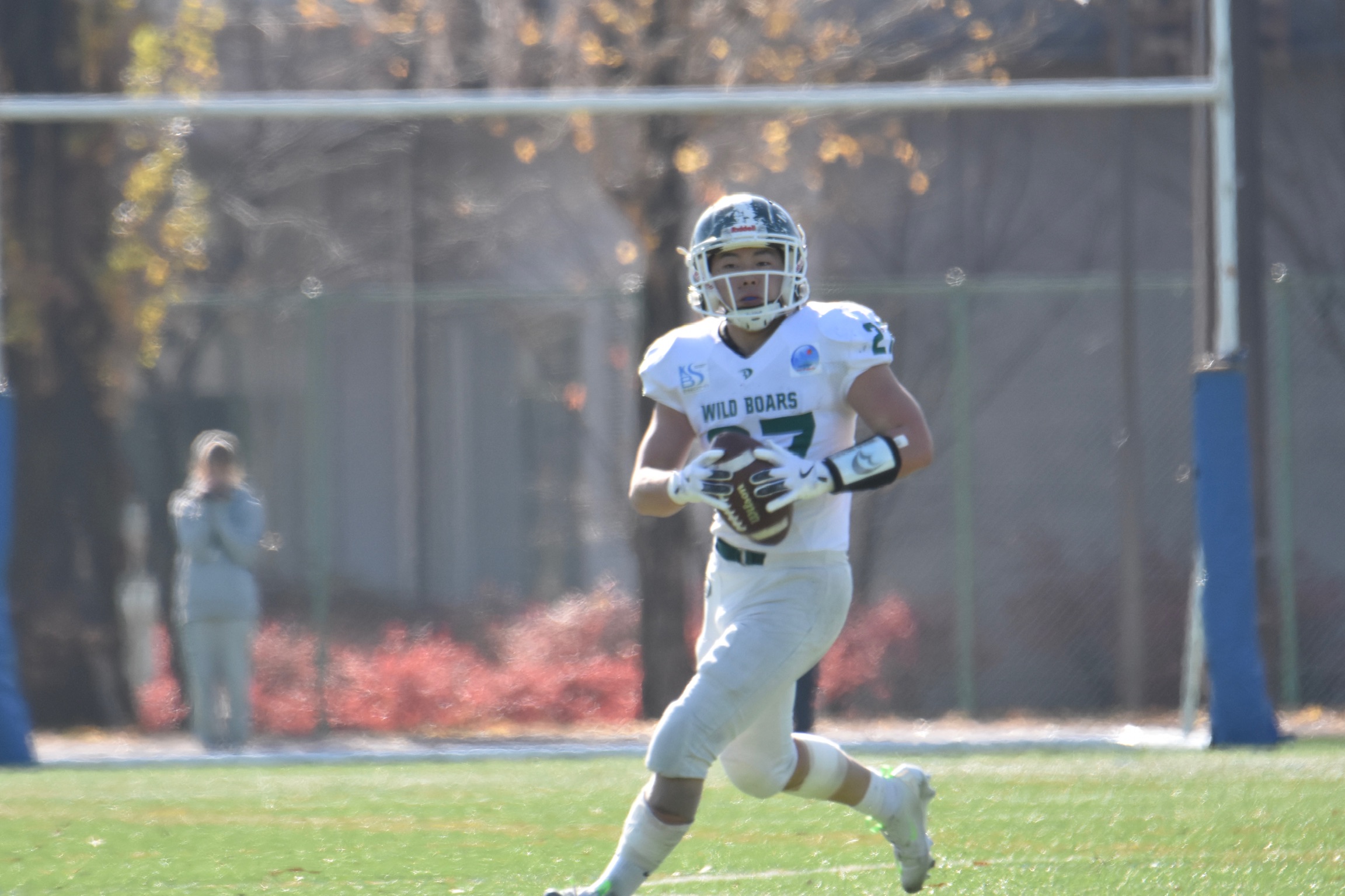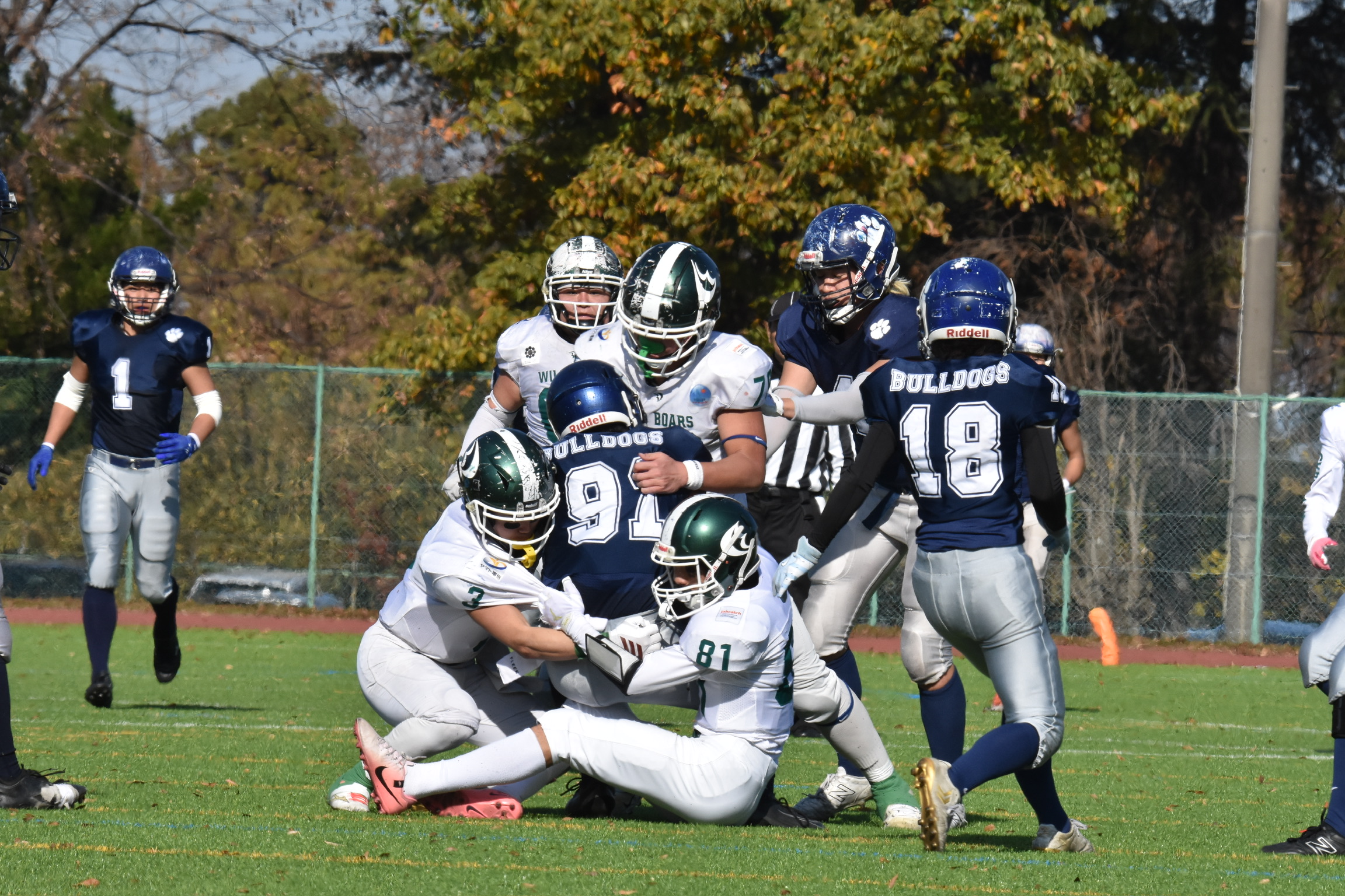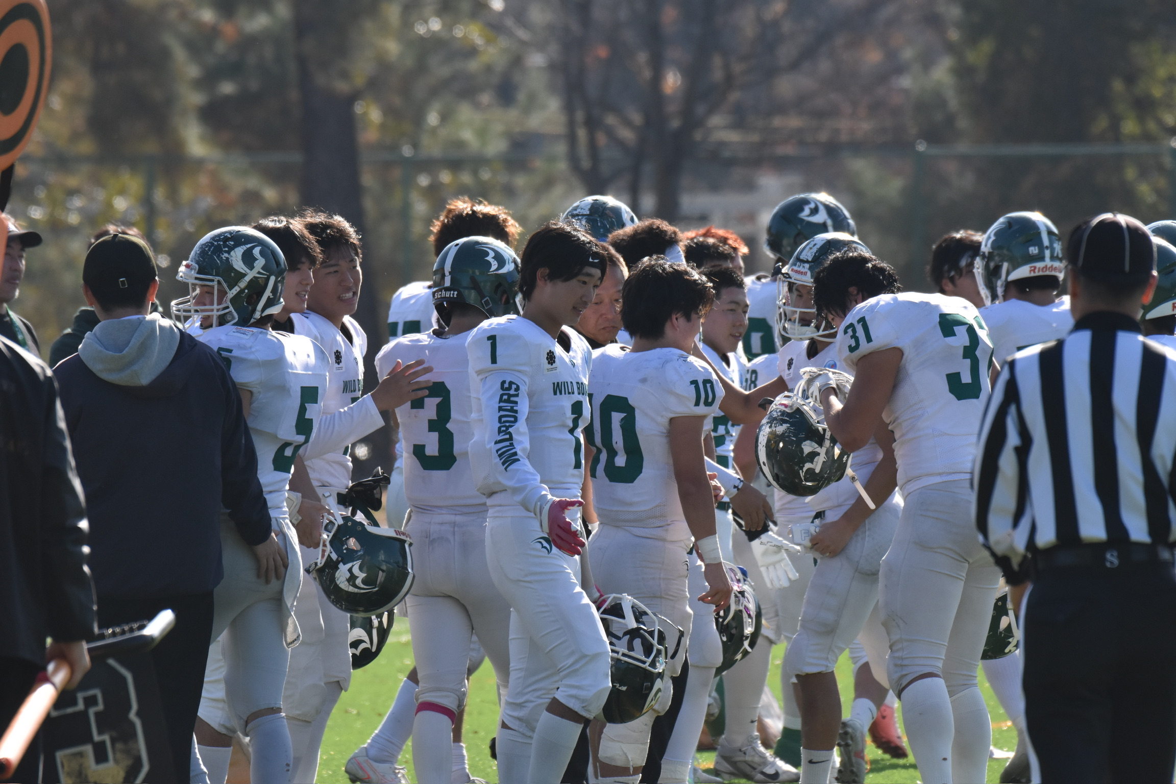 第4Q、攻撃に勢いがついた本学OFはオフェンシブ・ラインが立正大DFの壁を切り開き、そこに空いた穴に佐藤が自らボールを保持したままタッチダウン。続いて榎本のランプレーでボールを運ぶ。DFの動きをうまくかわし、40ヤードを走り切り、佐藤に続きタッチダウン。エクストラ・ポイントを獲得して試合終了間近で立正大に20-0で大きく差を開き、勝利となった。