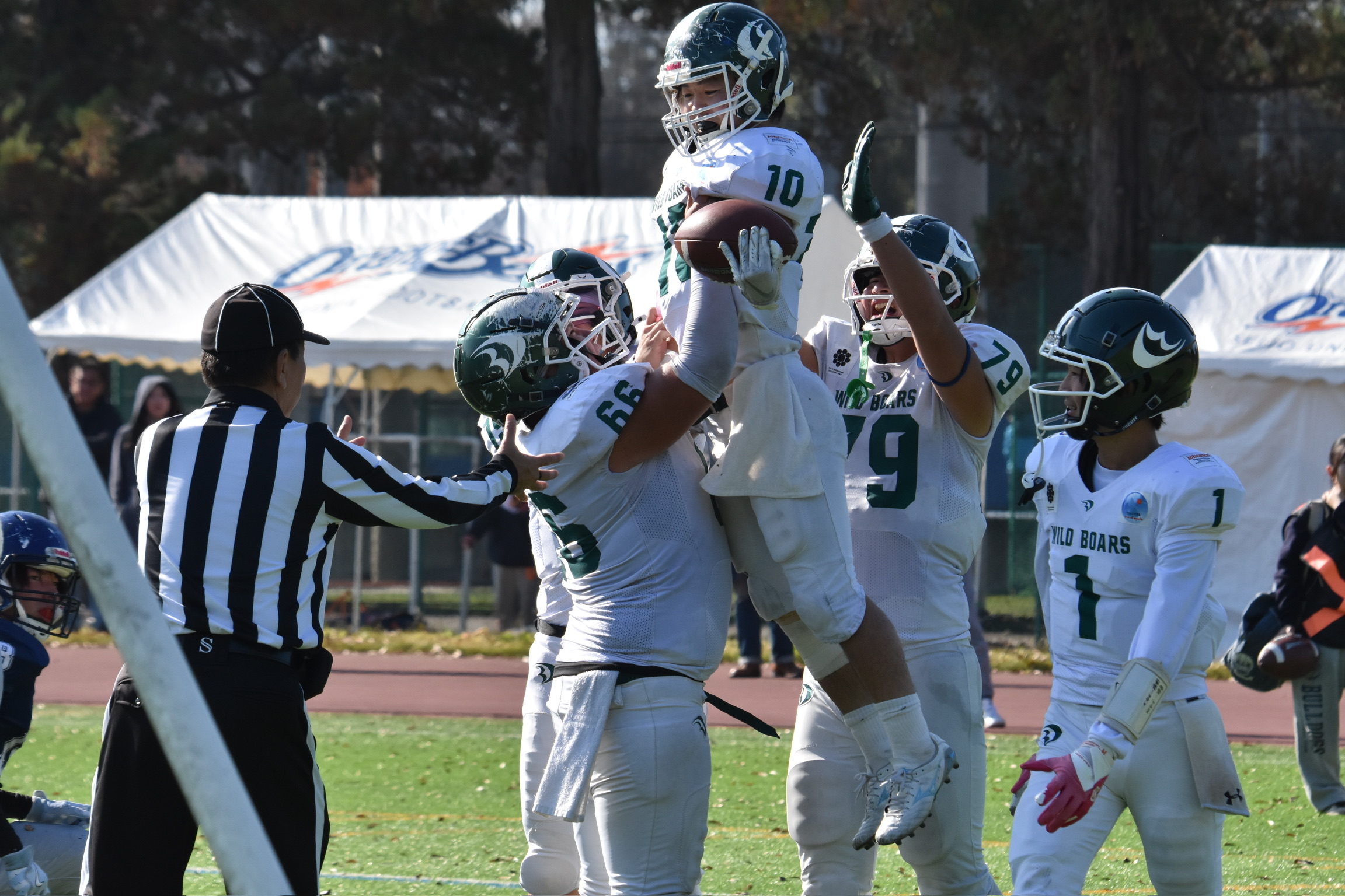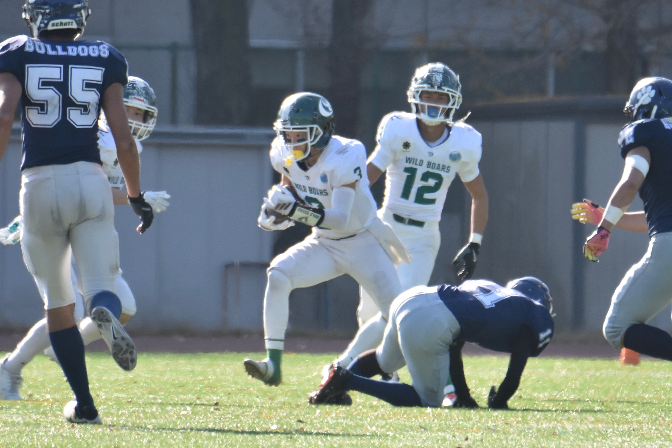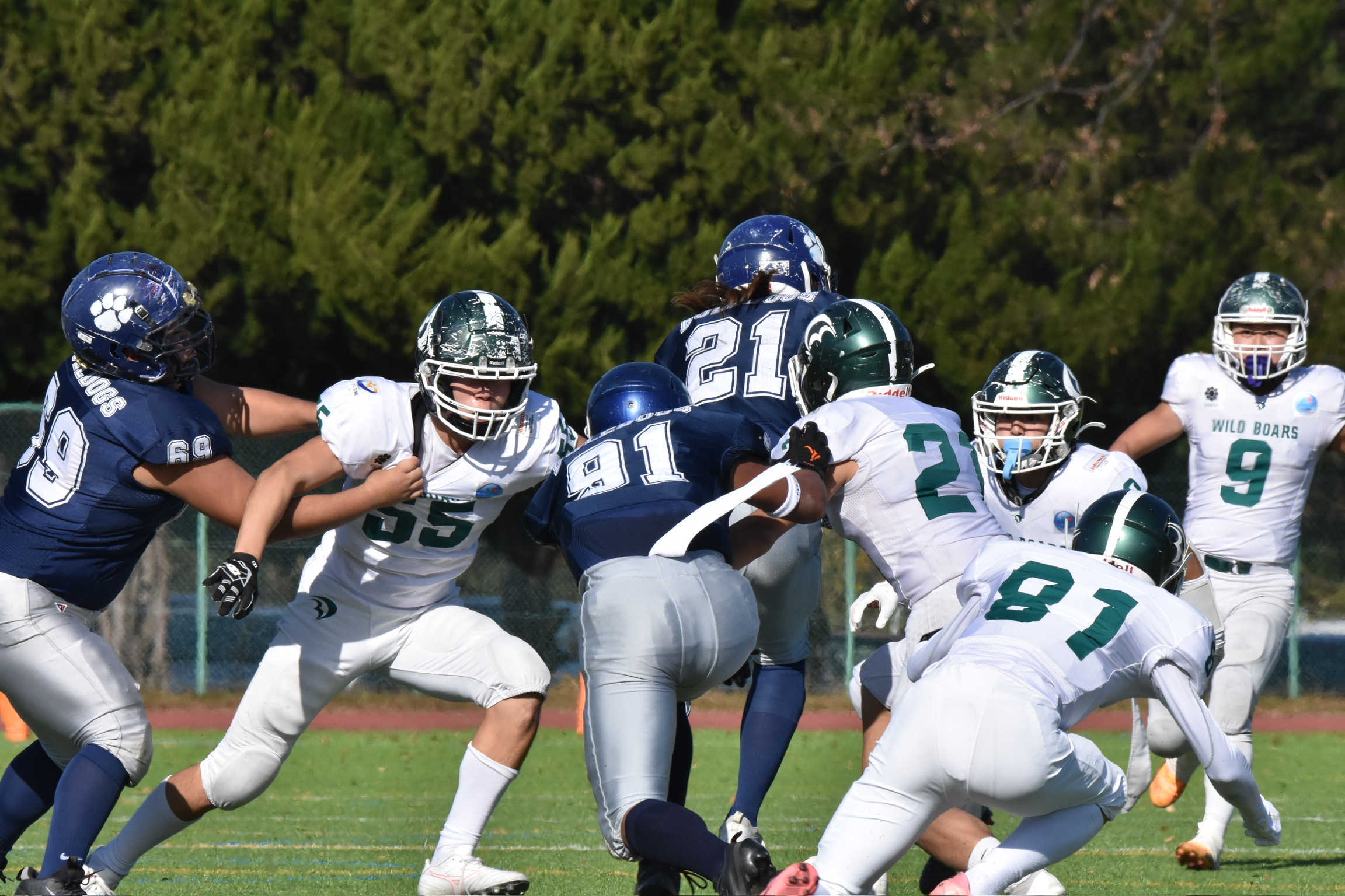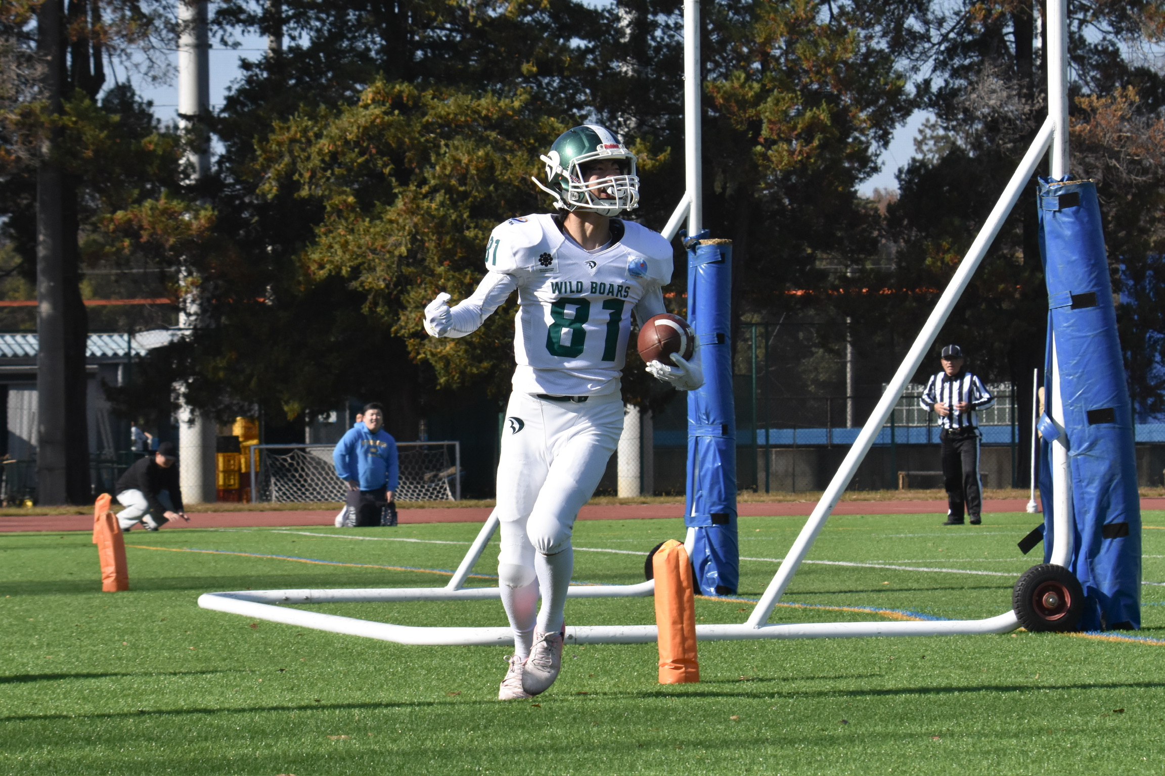 第4Q、攻撃に勢いがついた本学OFはオフェンシブ・ラインが立正大DFの壁を切り開き、そこに空いた穴に佐藤が自らボールを保持したままタッチダウン。続いて榎本のランプレーでボールを運ぶ。DFの動きをうまくかわし、40ヤードを走り切り、佐藤に続きタッチダウン。エクストラ・ポイントを獲得して試合終了間近で立正大に20-0で大きく差を開き、勝利となった。